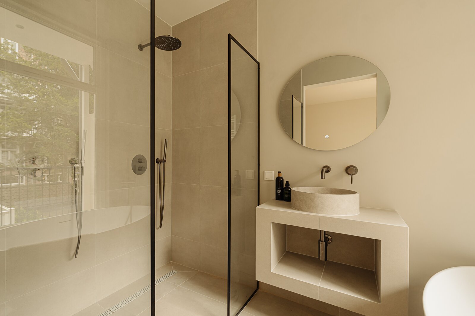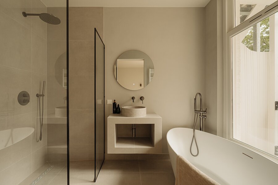 De tweede en derde slaapkamer liggen aan de voorzijde. In het midden van de verdieping bevindt zich de tweede badkamer, met inloopdouche en dubbele wastafel.