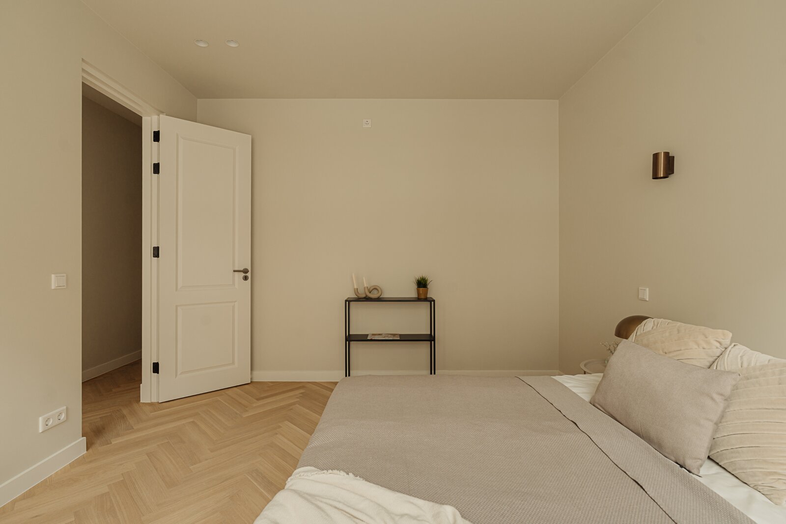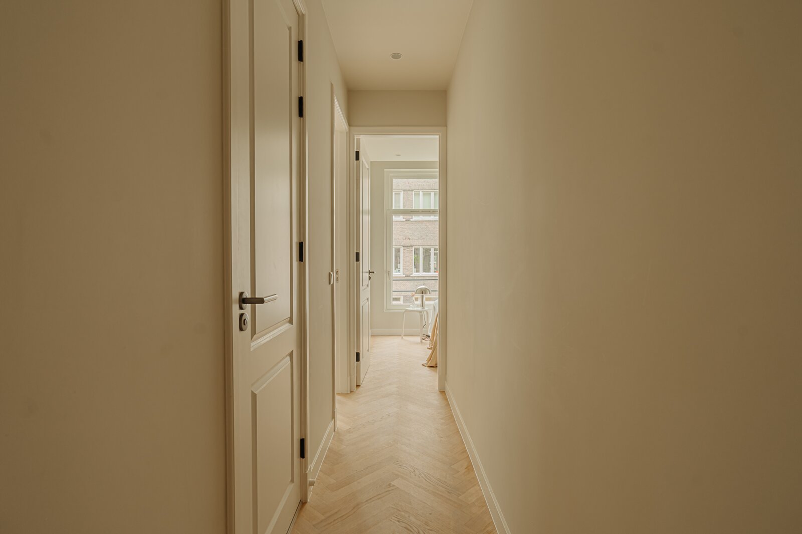 Door het gehele appartement ligt een houten visgraatvloer met vloerverwarming.