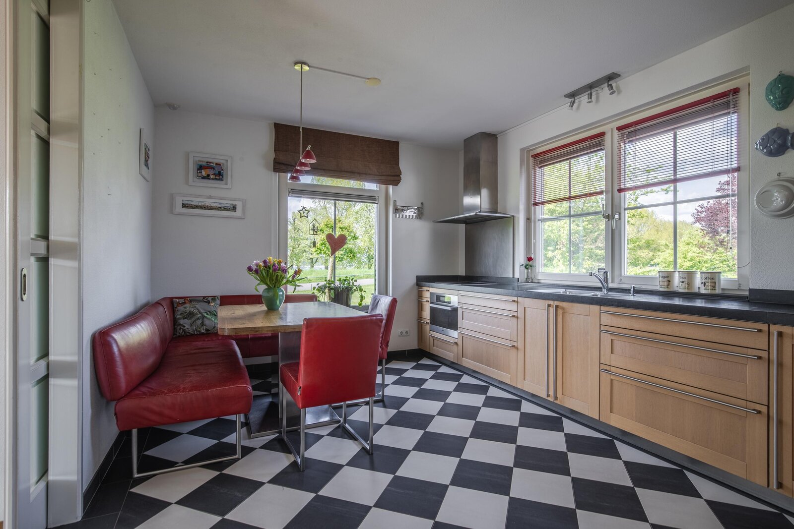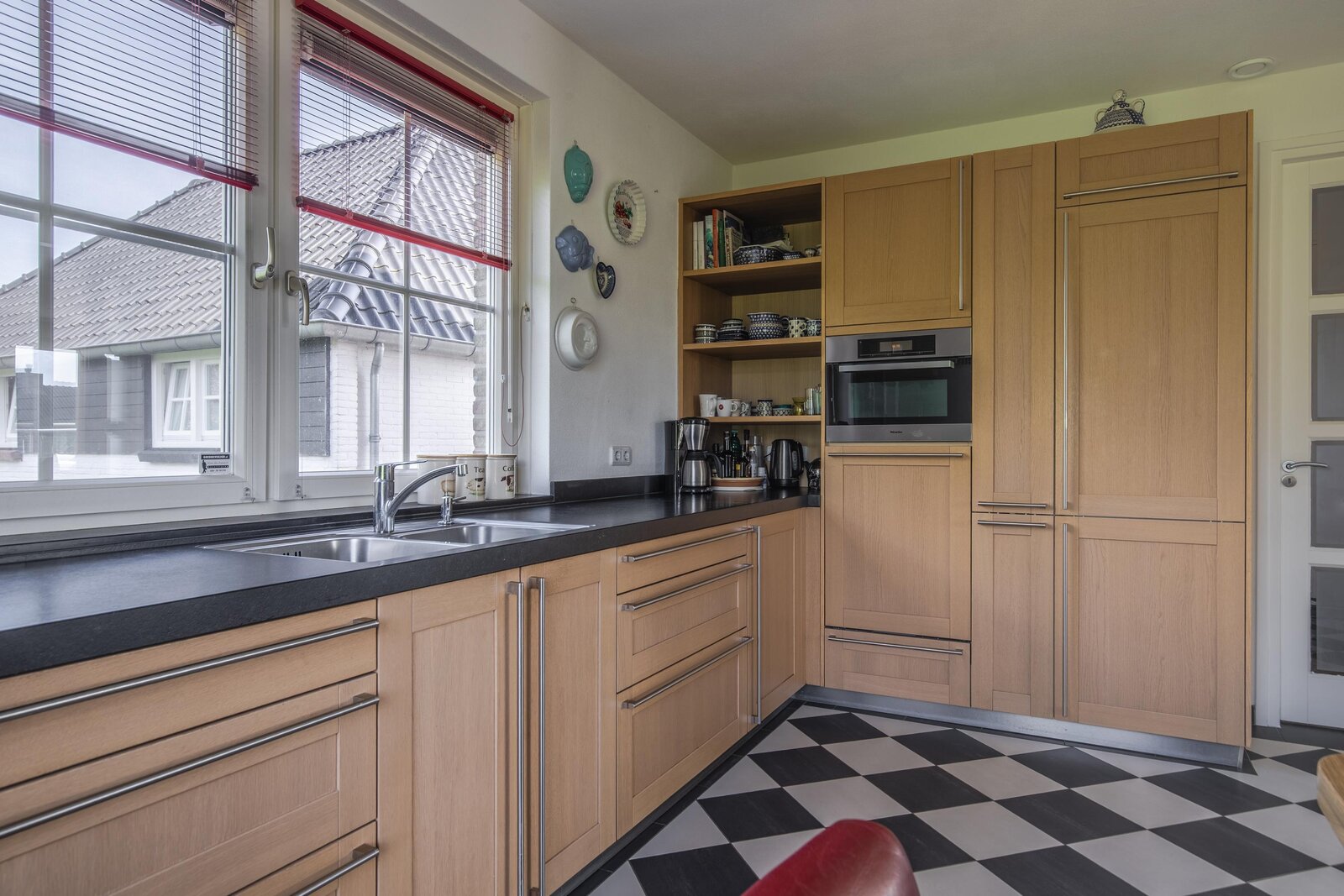 Op dijkniveau entree via een statige voordeur, hal met meterkast, deur naar royale woonkamer met tegels uitgevoerd in eiken en sfeervolle houtkachel. Dankzij de raamkozijnen aan meerdere zijden en de openslaande deuren naar het ruime, op het zuidwesten gelegen (dak)terras geniet u van veel natuurlijk licht en een prachtig uitzicht. Via schuifdeuren vanuit de woonkamer toegang tot de heerlijke leefkeuken, uitgevoerd in houten kasten en composiet antraciet grijs aanrechtblad. De keuken is compleet ingericht met een hetelucht-/stoomoven, een gecombineerde stoomoven en een combi-oven/magnetron uit 2025, inductiekookplaat en RVS afzuigkap, dubbele wasbak met zeepdispenser, vaatwasser (2022), magnetron en koel- en vriescombinatie (2021). Vanuit de keuken doorloop naar overloop, welke toegang biedt tot de bovengelegen verdiepingen en ondergelegen souterrain. Toilet uitgevoerd in lichte kleurstelling met wandcloset en fontein.