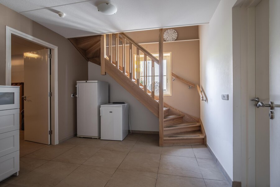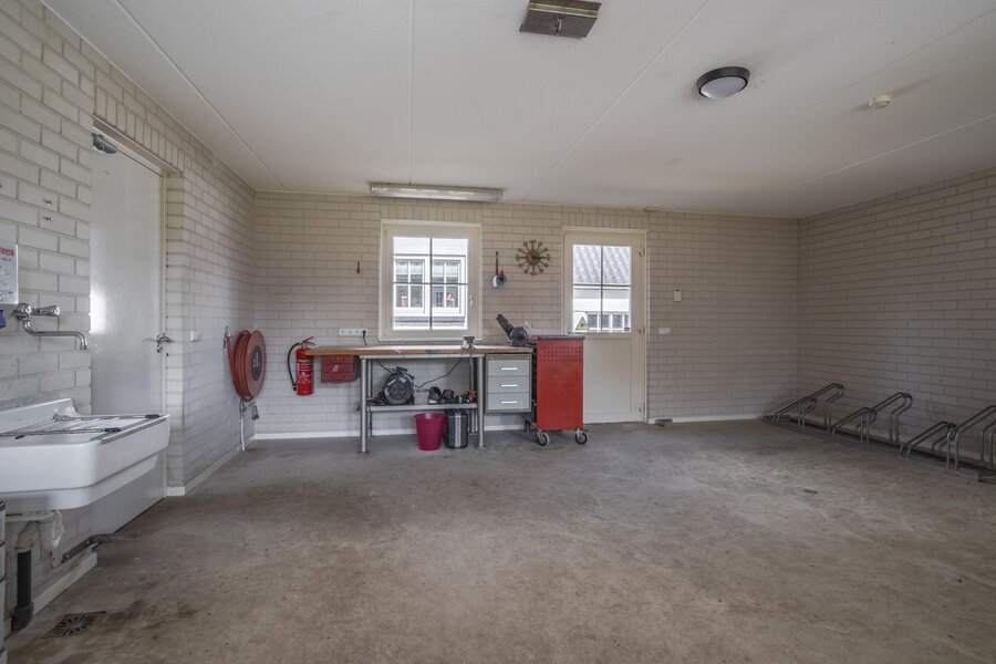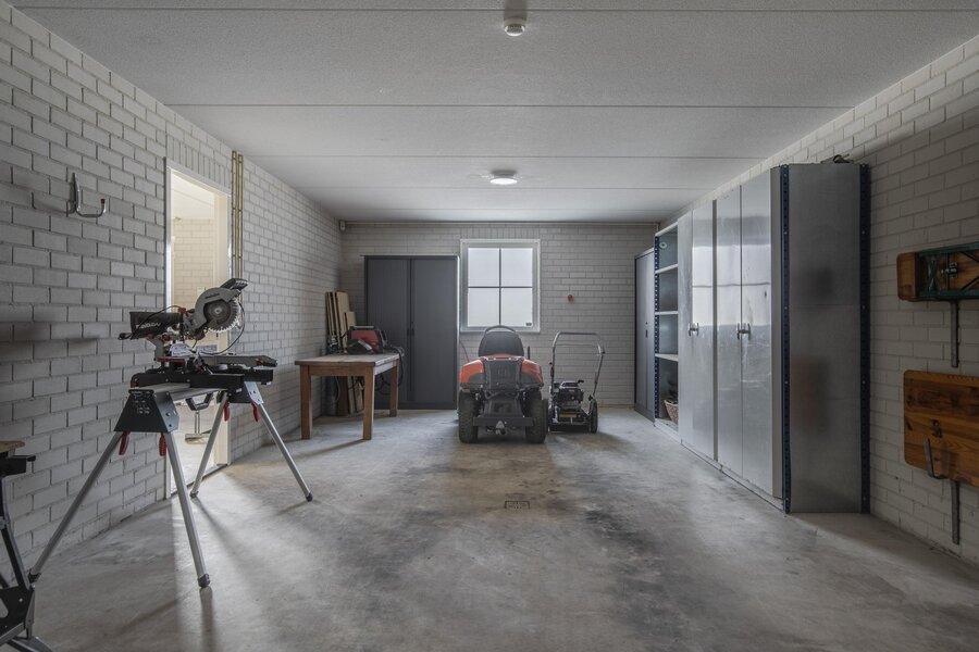 De benedenverdieping biedt een aangename verrassing met een praktische indeling in meerdere royale bergruimtes, een tweede badkamer met toilet en douche, en een grote multifunctionele hobbyruimte. Daarnaast zijn hier ook de functionele voorzieningen ondergebracht, zoals de watertank (inhoud 5000 liter) met waterpomp, aansluitingen voor was apparatuur en de Cv-ketel. Vanuit de hobbyruimte is er via openslaande deuren toegang tot een heerlijke veranda. De mogelijkheden in het souterrain zijn talrijk: het creëren van een praktijkruimte of atelier met een zelfstandige ingang en eigen toilet- en doucheruimte behoort tot de mogelijkheden. Via één van de bergruimtes met loopdeur van en naar de veranda en achteruitgang, beschikt deze ruimte over een wastafel, trap naar ruime bergzolder en biedt toegang tot de garage. Naast de garage is een ruime- en hoge overkapping gelegen.