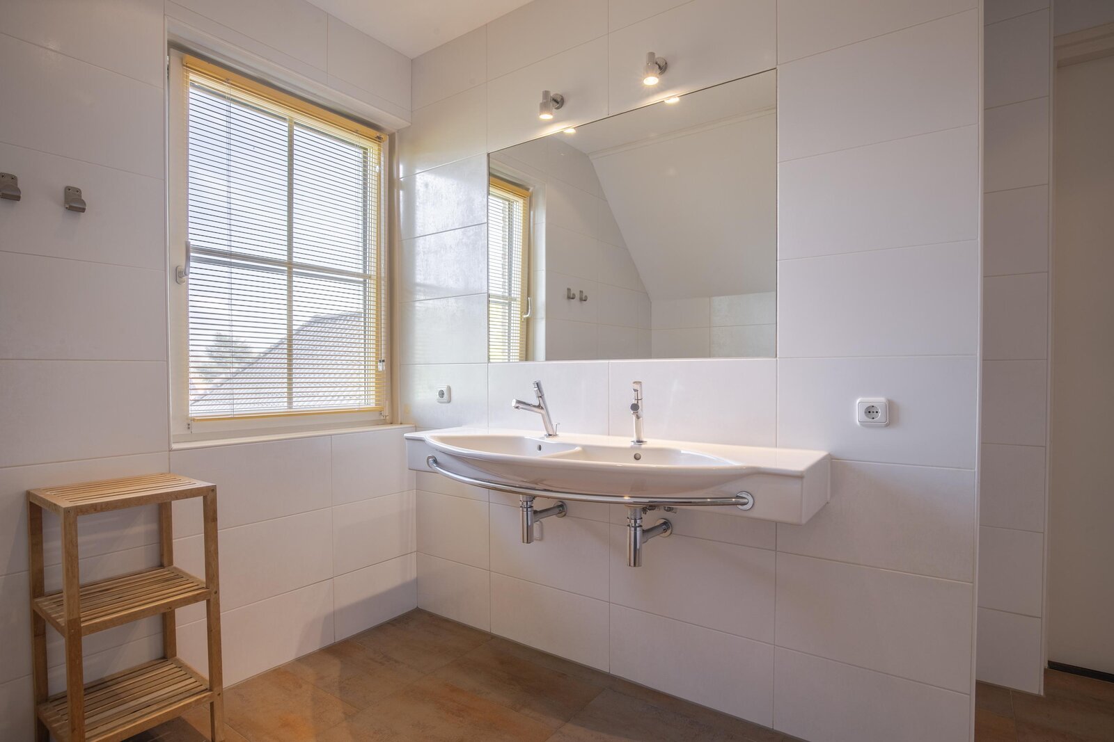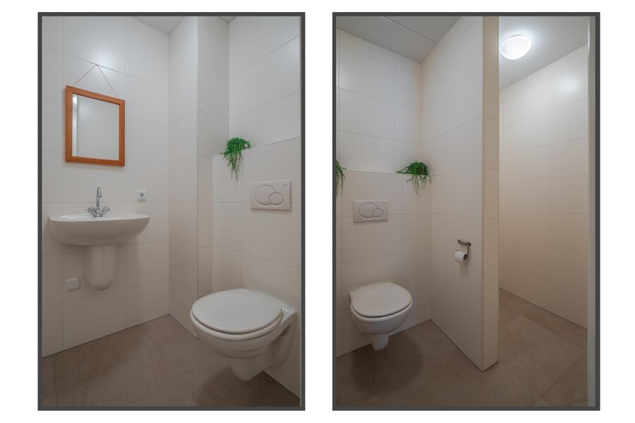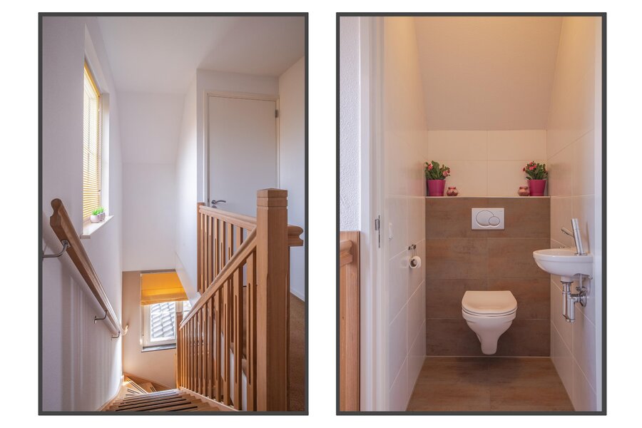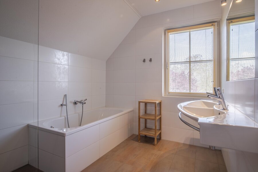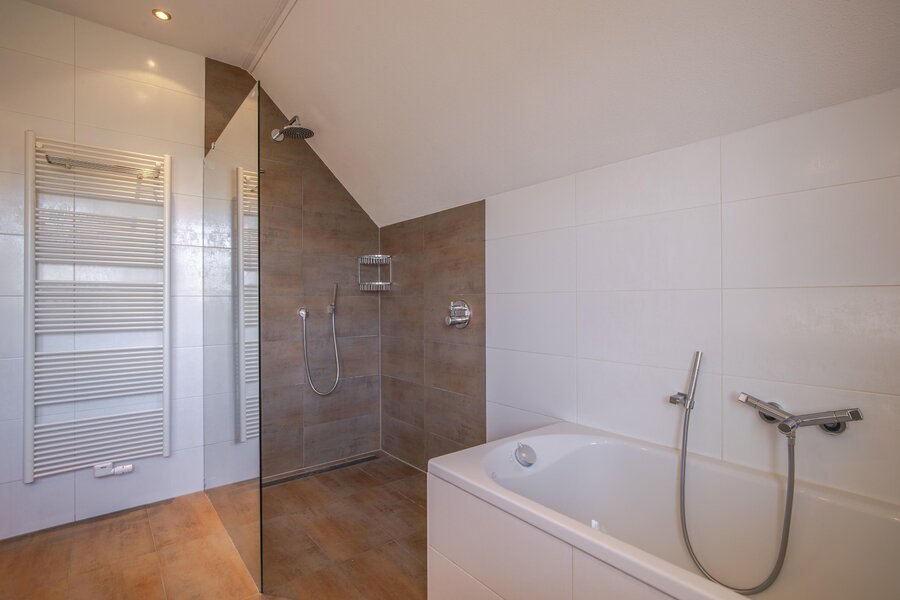 Ruime overloop met lange gang, drie zeer royale slaapkamers, allen voorzien van draaikiepramen met hor en rolluik. Tweede toiletruimte, eveneens met wandcloset en fontein. Moderne badkamer ingericht in beige en witte kleurstelling met inloopdouche met inbouwkranen, ligbad en dubbele wastafel met wandspiegel. De badkamer is tevens voorzien van vloerverwarming, evenals een extra radiator die tevens als droogrek dient voor extra comfort.