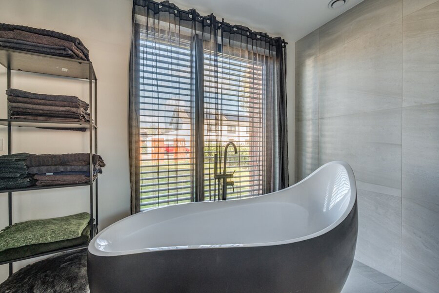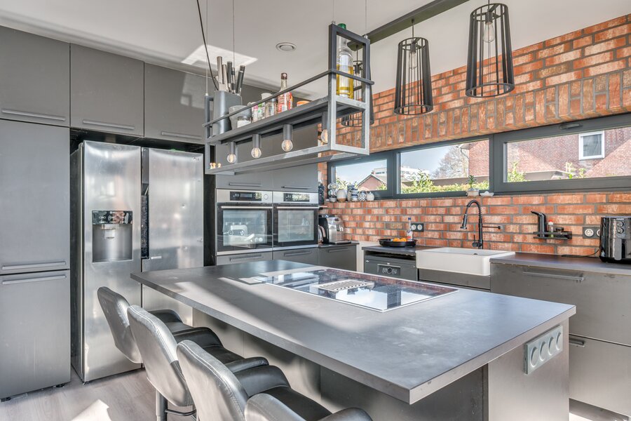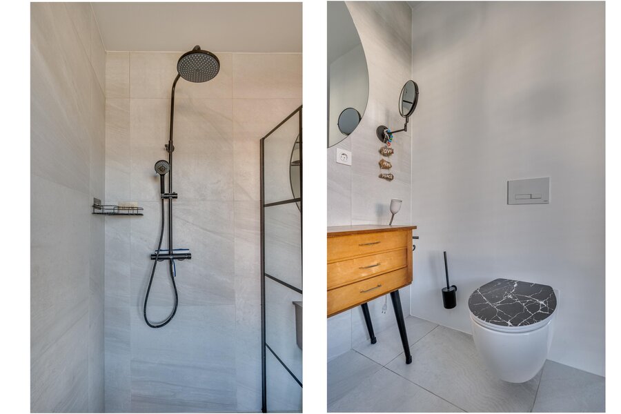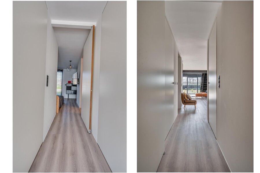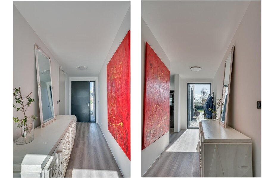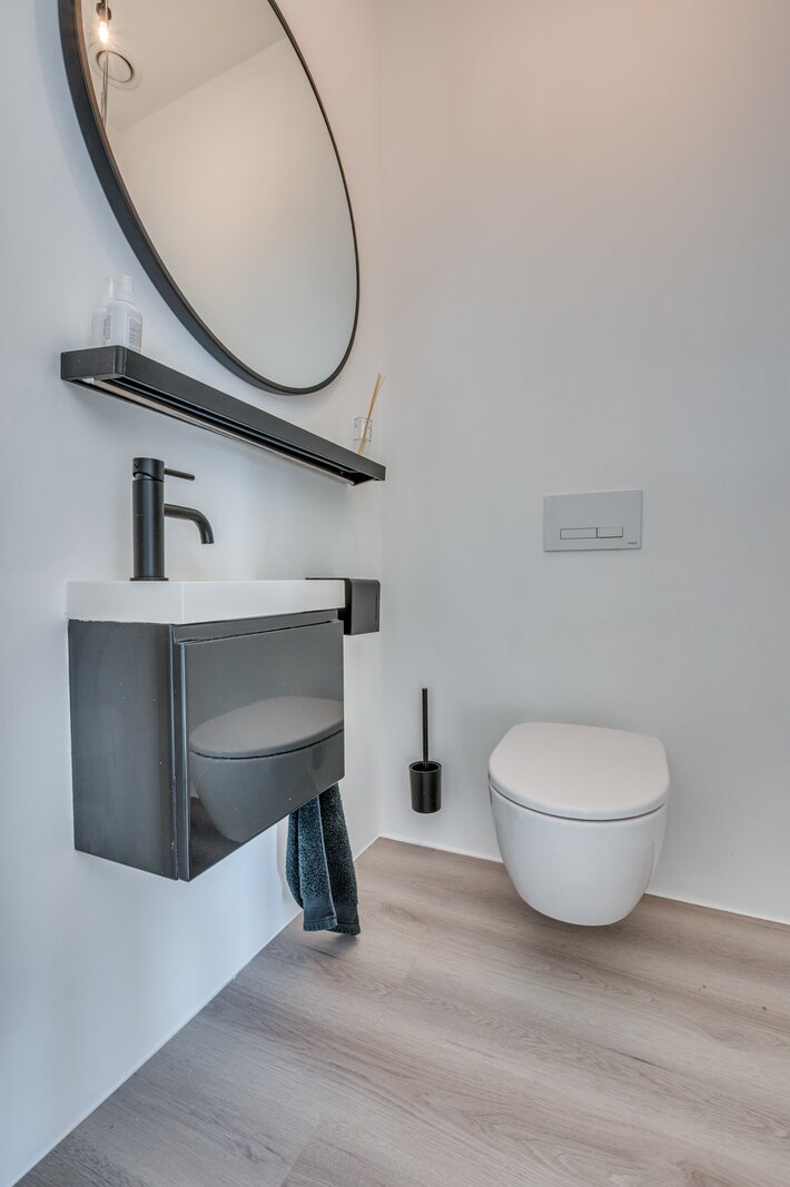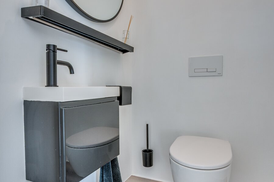 De ruime woon/ eetkamer is voorzien van zeer veel lichtinval door de grote raampartijen aan de achterzijde. De keuken is voorzien van een kookeiland en ingericht met een inductiefornuis met interne BORA afzuiging, vaatwasmachine, stoomoven, heteluchtoven, koelkast en diepvries. Middels een brede schuifpui is de tuin te bereiken. De 1e kleine slaapkamers heeft een ensuite inloopdouche met wastafel en meubel. De separate toiletruimte is voorzien van een zwevend toilet, mechanische ventilatie en fonteintje. De masterbedroom op de begane grond is voorzien van een ruime inloopkast en badkamer ensuite. De slaapkamer is ca. 12.5m²groot. De badkamer is geheel betegeld en voorzien van een ligbad, inloopdouche, wastafel met meubel, zwevend toilet en mechanische ventilatie. De begane grond beschikt verder over een inpandige berging waar de witgoedaansluitingen gepositioneerd zijn.