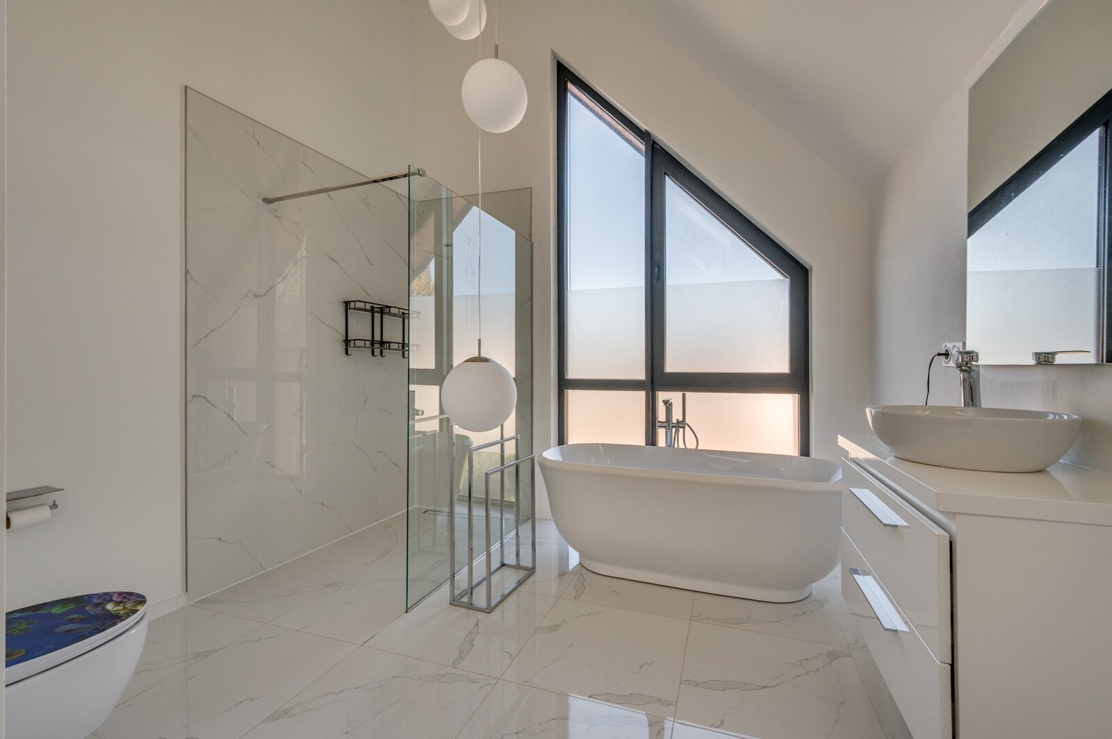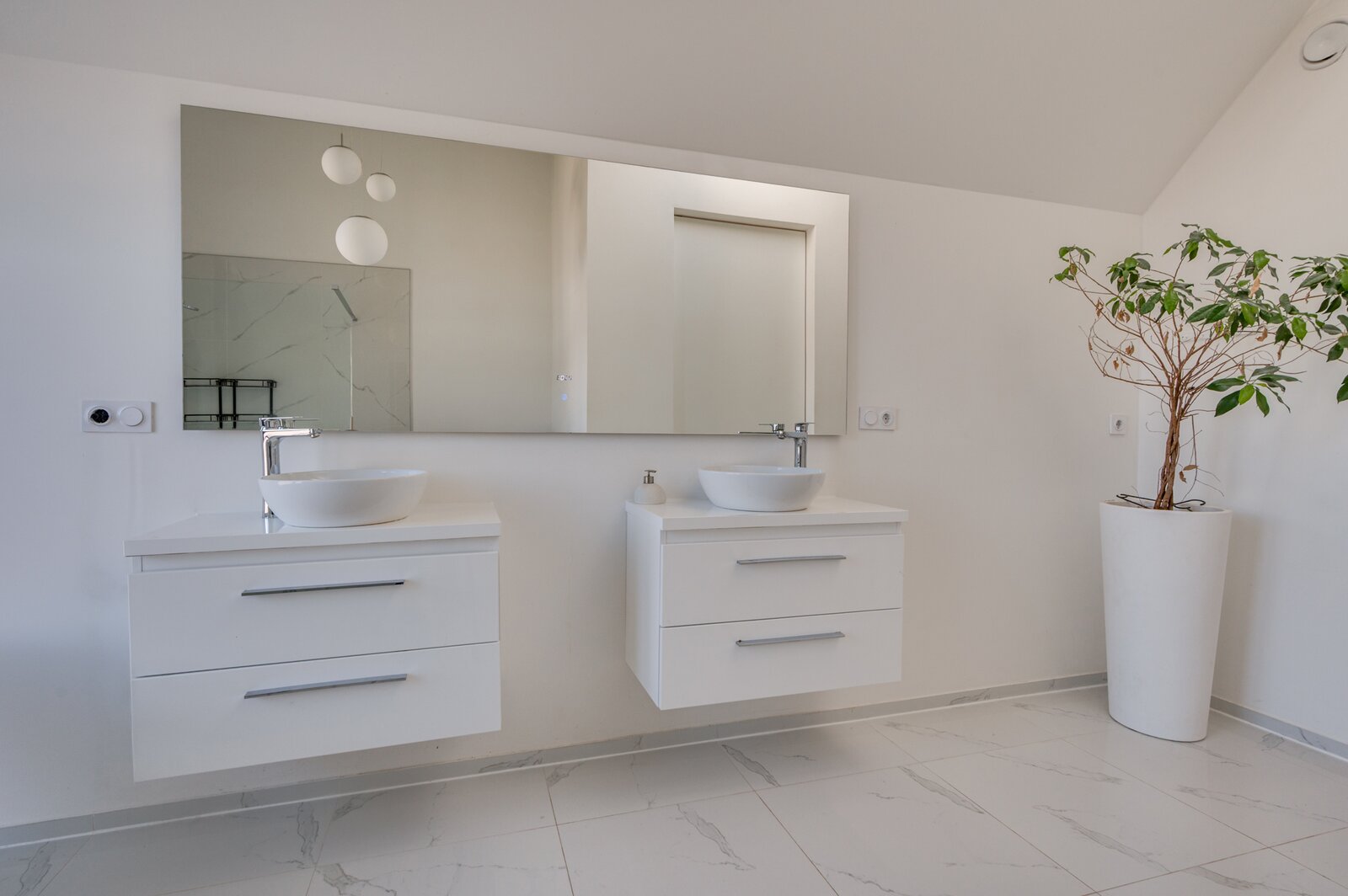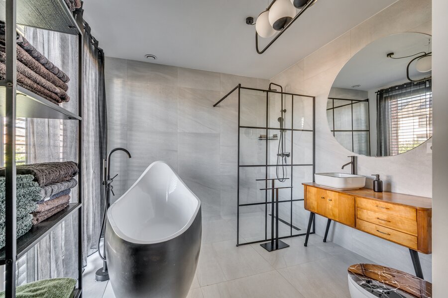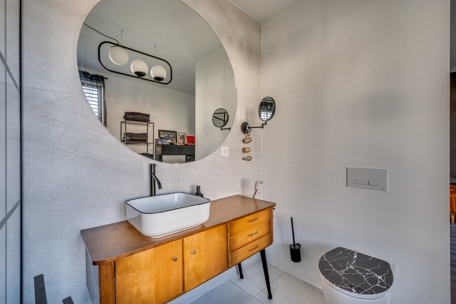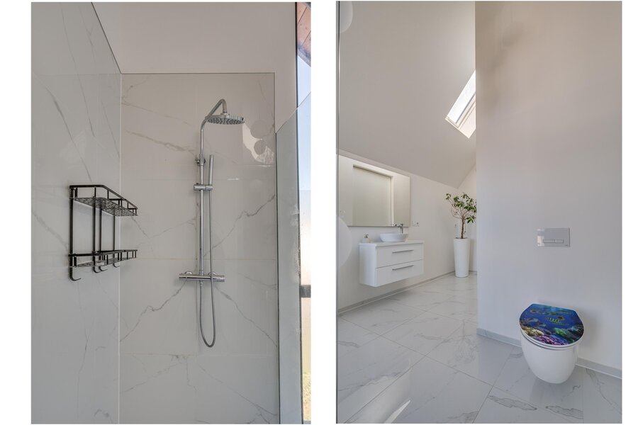 De ruime woon/ eetkamer is voorzien van zeer veel lichtinval door de grote raampartijen aan de achterzijde. De keuken is voorzien van een kookeiland en ingericht met een inductiefornuis met interne BORA afzuiging, vaatwasmachine, stoomoven, heteluchtoven, koelkast en diepvries. Middels een brede schuifpui is de tuin te bereiken. De 1e kleine slaapkamers heeft een ensuite inloopdouche met wastafel en meubel. De separate toiletruimte is voorzien van een zwevend toilet, mechanische ventilatie en fonteintje. De masterbedroom op de begane grond is voorzien van een ruime inloopkast en badkamer ensuite. De slaapkamer is ca. 12.5m²groot. De badkamer is geheel betegeld en voorzien van een ligbad, inloopdouche, wastafel met meubel, zwevend toilet en mechanische ventilatie. De begane grond beschikt verder over een inpandige berging waar de witgoedaansluitingen gepositioneerd zijn.