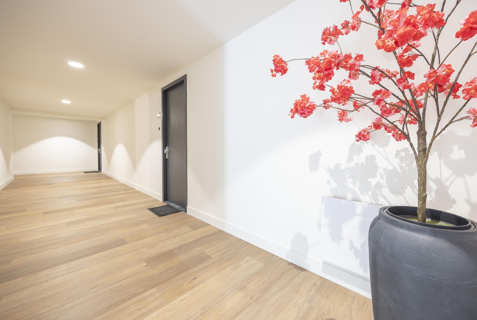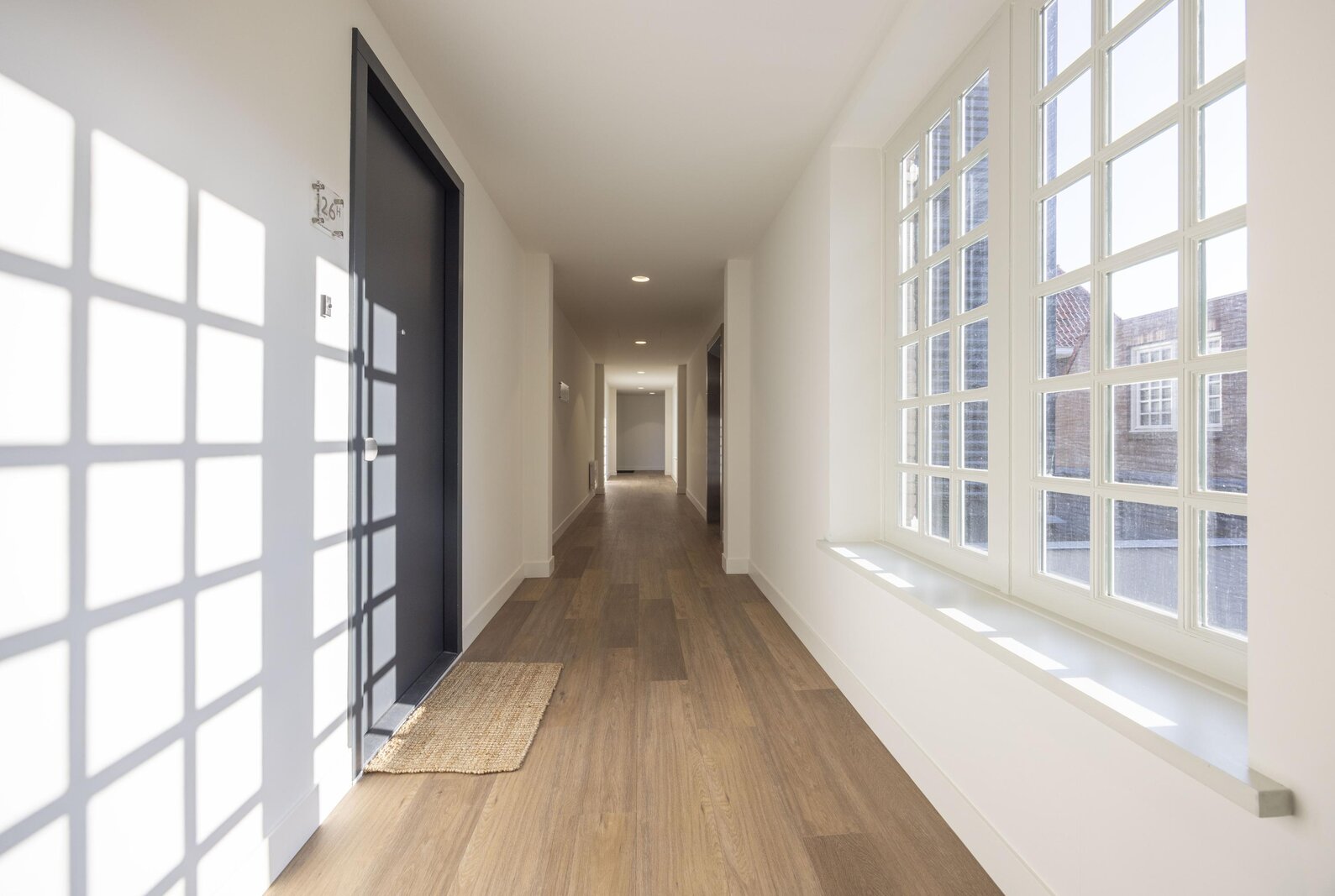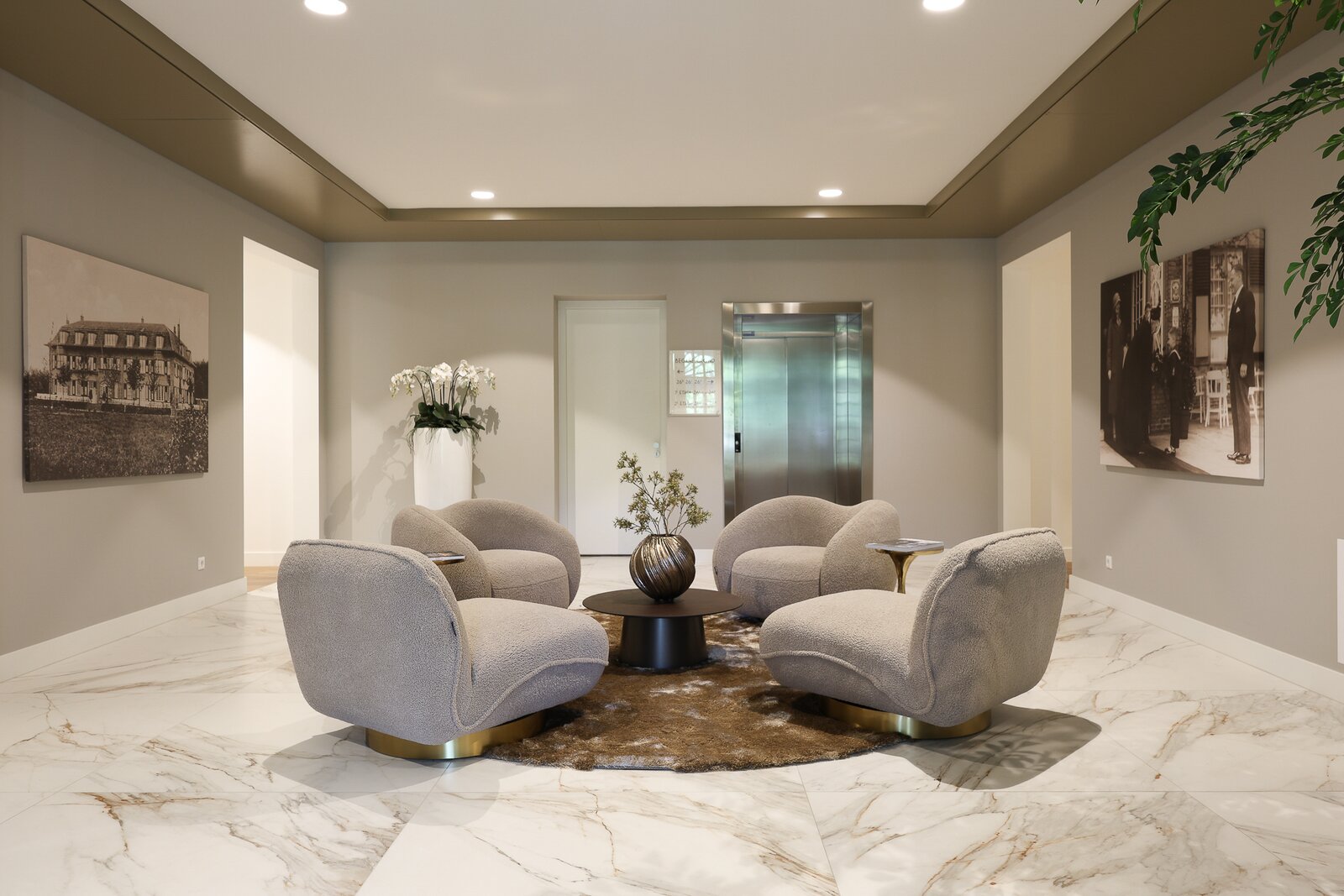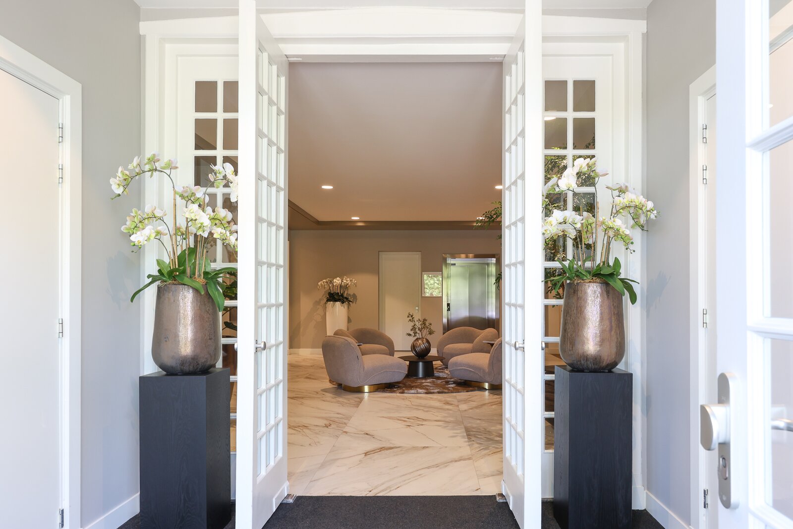 Via de imposante entree is het luxe appartementencomplex te betreden. Hier bevinden zich de postbussen en bellentableau met videofooninstallatie. Vanuit deze hal toegang tot het trappenhuis en de lift. Het appartement is op de eerste verdieping gelegen.