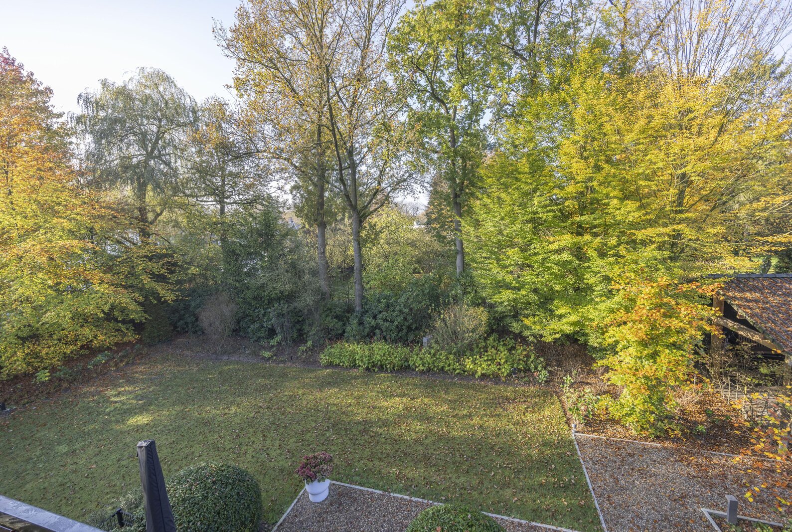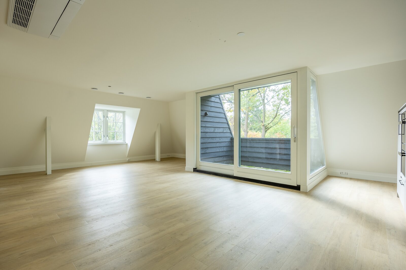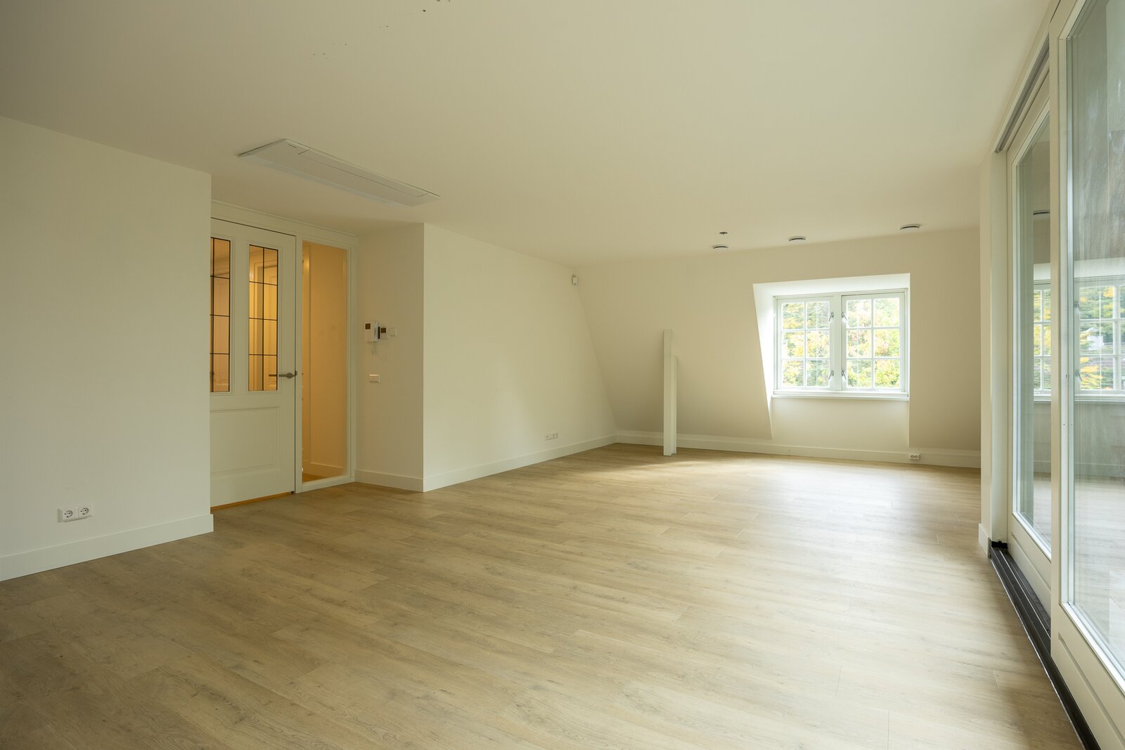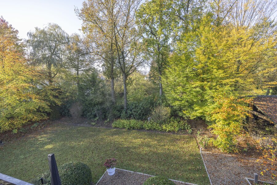 De lichte living heeft een prettige lichtinval en prachtig zicht op de omliggende tuin. Vanuit de living biedt een schuifpui toegang tot het balkon (loggia). Door de beschutte ligging kunt u hier in meerdere seizoenen genieten.