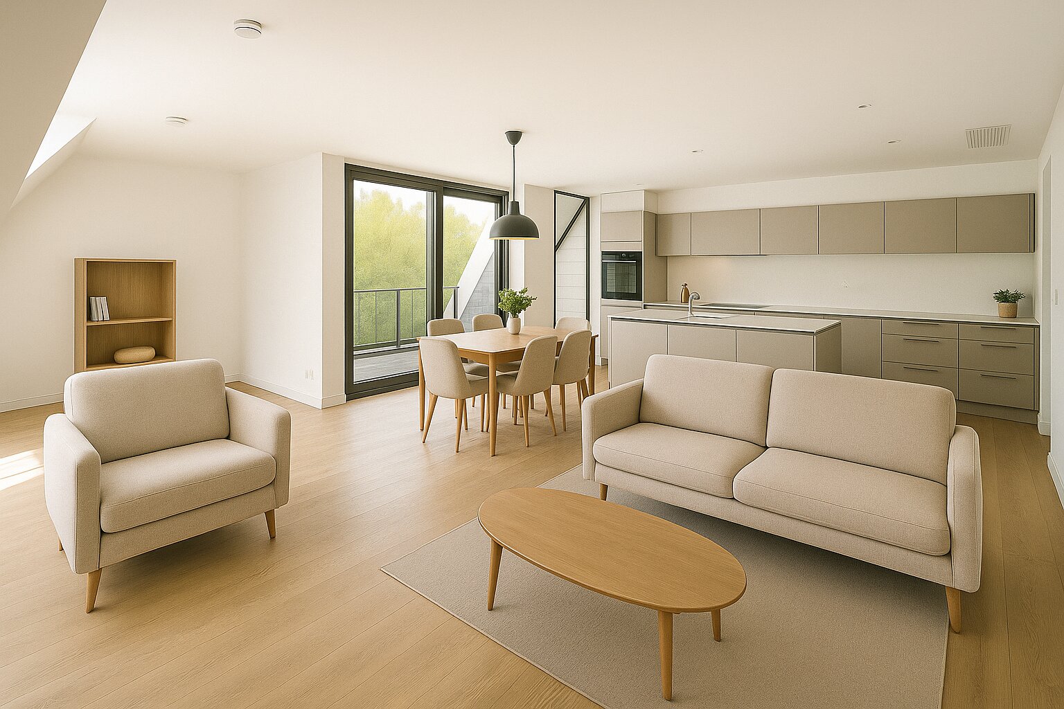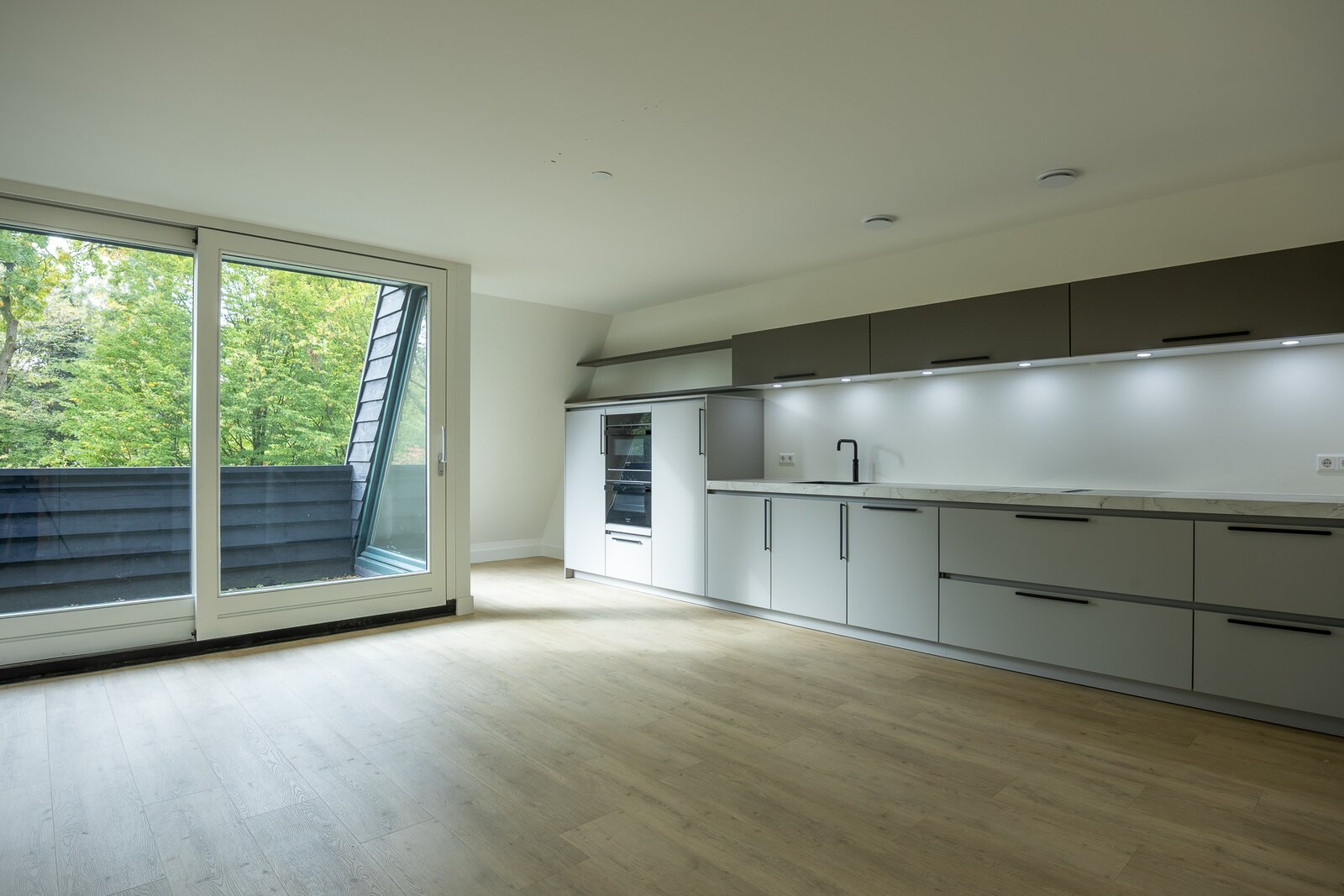 • Living met open keuken en grote schuifpui naar het beschut gelegen balkon;