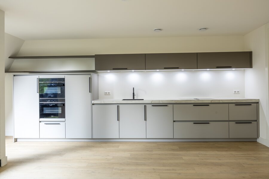 Open luxe keuken voorzien diverse inbouwapparatuur, te weten: een 4-pits inductiekookplaat met afzuiging, Quooker, magnetron, oven en vaatwasser. Direct naast de keuken ligt een aparte berging die een zeer functionele aanvulling is op de keuken. Hierin bevinden zich de warmtepomp, aansluiting was-apparatuur en WTW-unit.