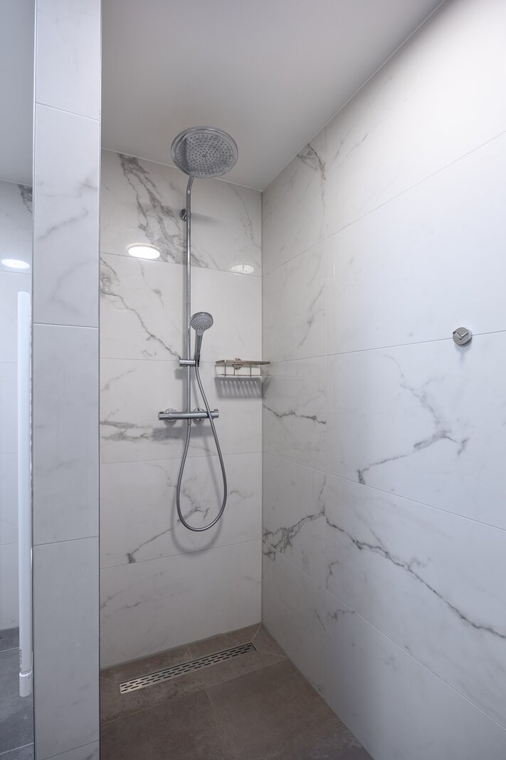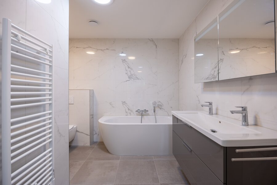 De moderne, geheel betegelde, badkamer is voorzien van een ligbad, ruime inloopdouche, dubbele wastafel in meubel en wandcloset. De badkamer en het tweede toilet zijn in dezelfde stijl afgewerkt en eveneens voorzien van vloerverwarming.