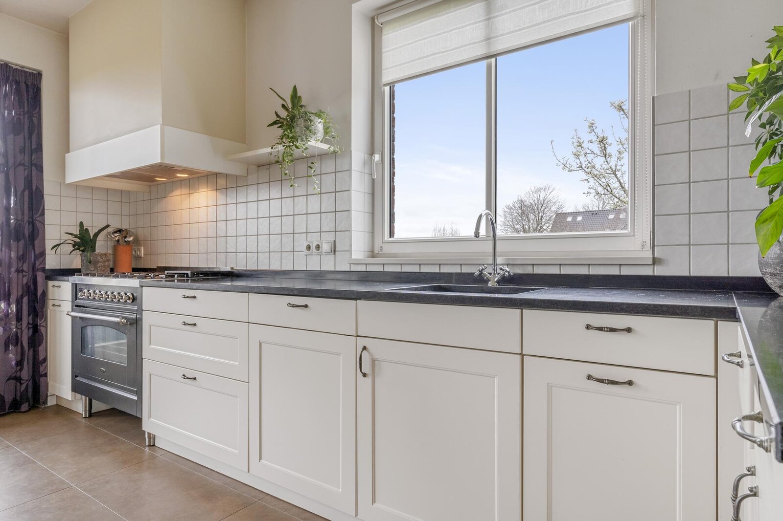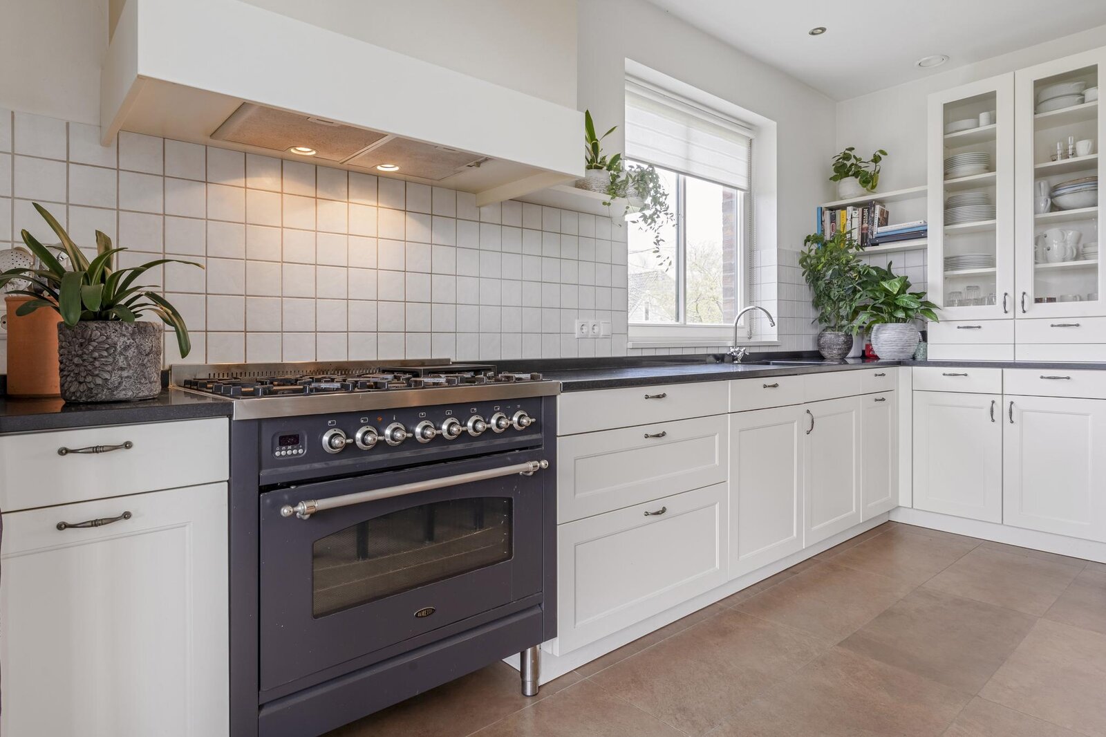 Entree; hal met meterkast, luxe eikenhouten trapopgang, toegang tot het souterrain (v.v. meerdere kamers en warmtepomp) en toilet; woonkamer met sfeervolle houtkachel en schuifdeuren naar de landelijke, luxe woonkeuken met openslaande deuren naar de veranda; bijkeuken met aansluiting voor wasmachine en droger; kantoorruimte.