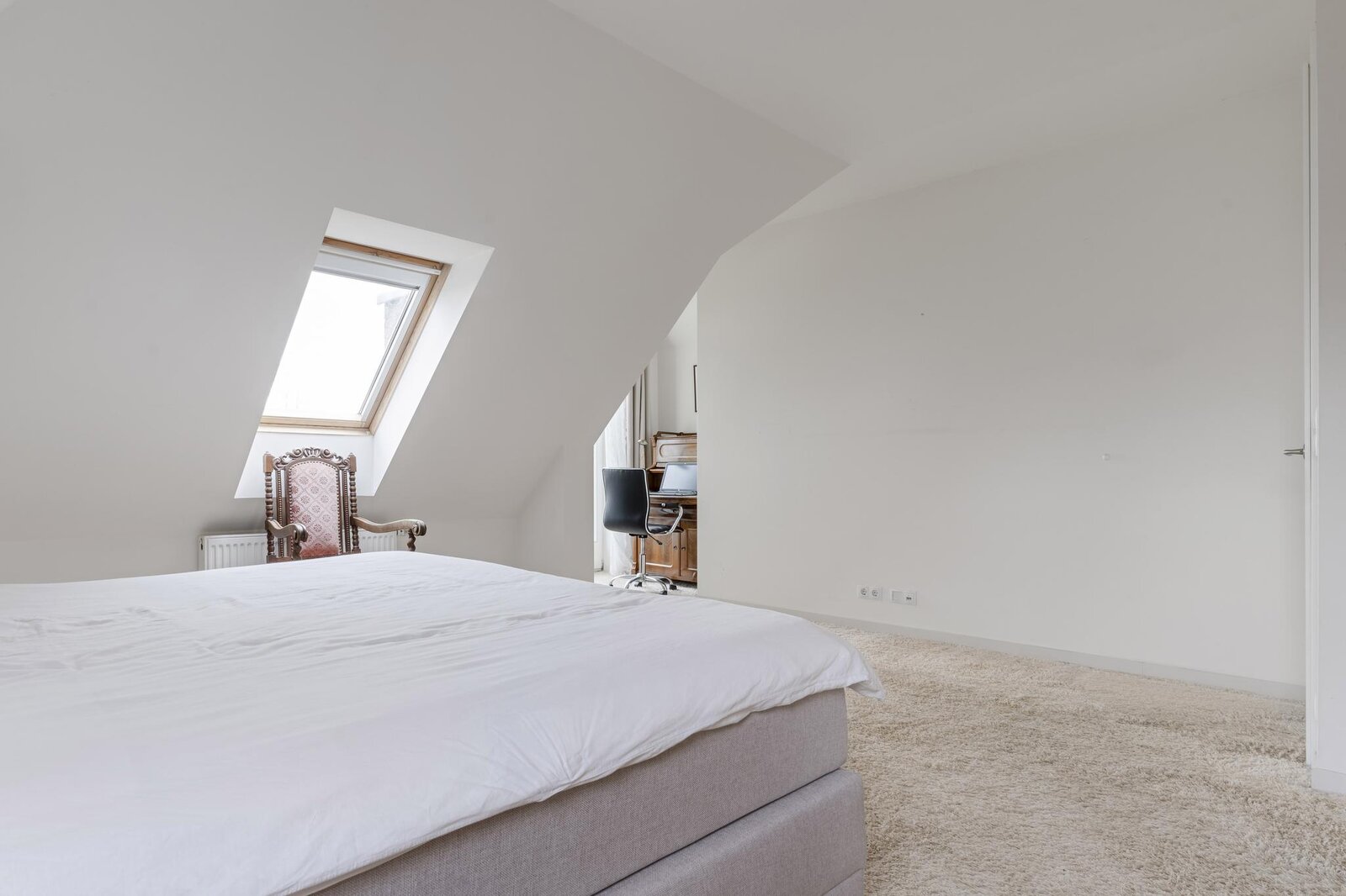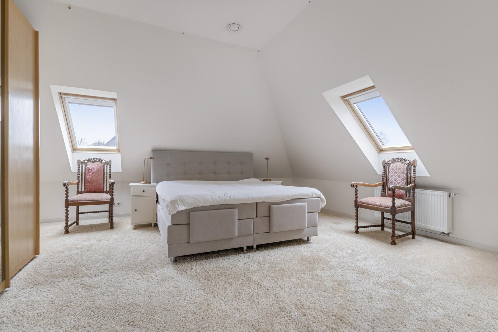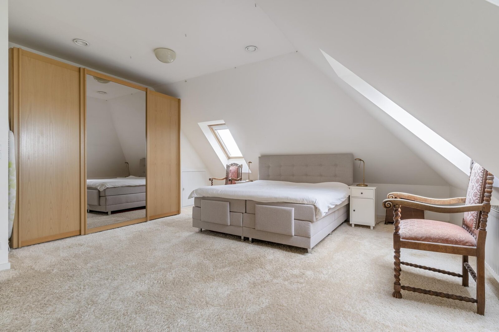 Trapopgang die direct uitkomt in de grote slaapkamer aan de achterzijde met bijbehorende tweede badkamer voorzien van douche, toilet en wastafel.