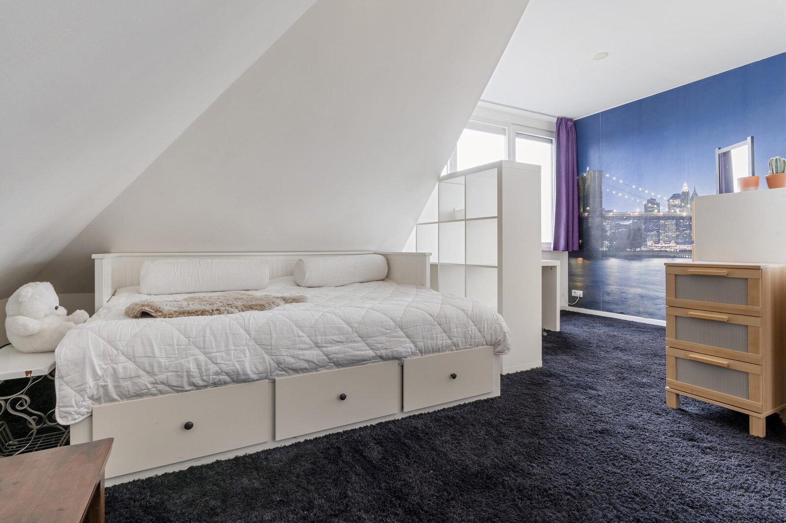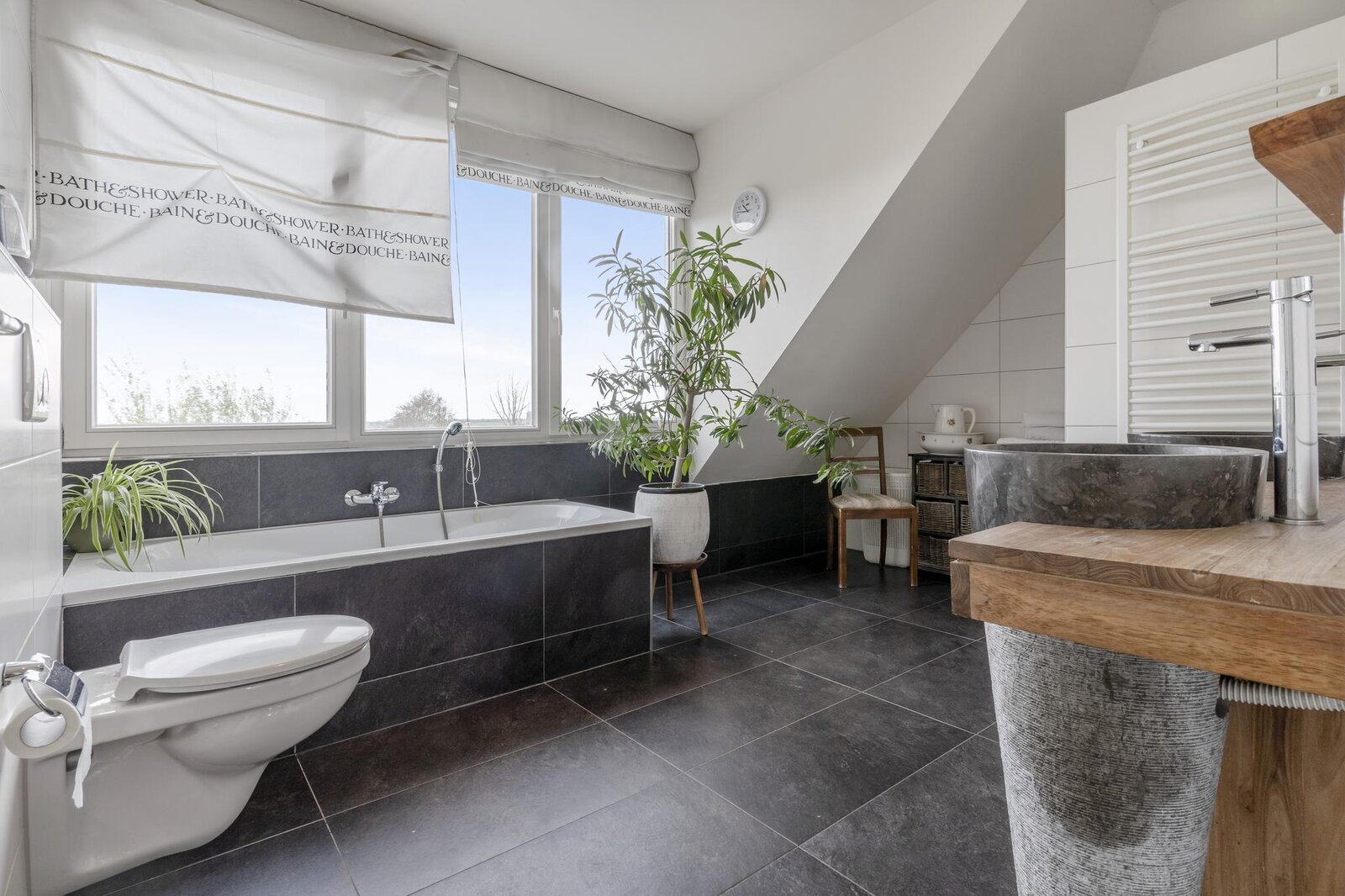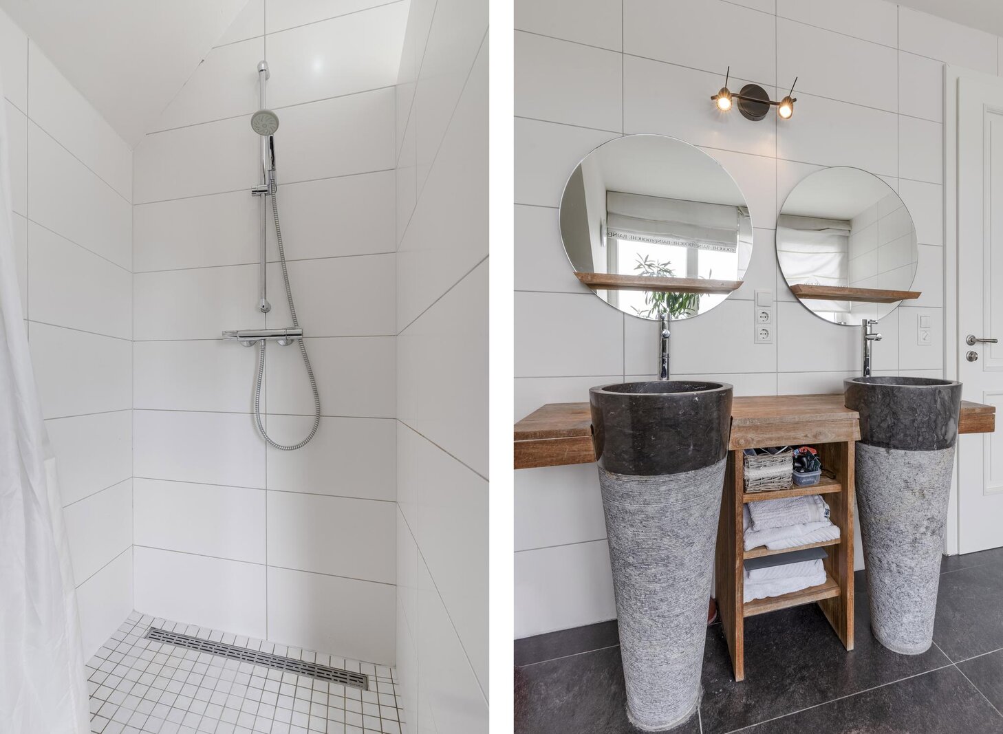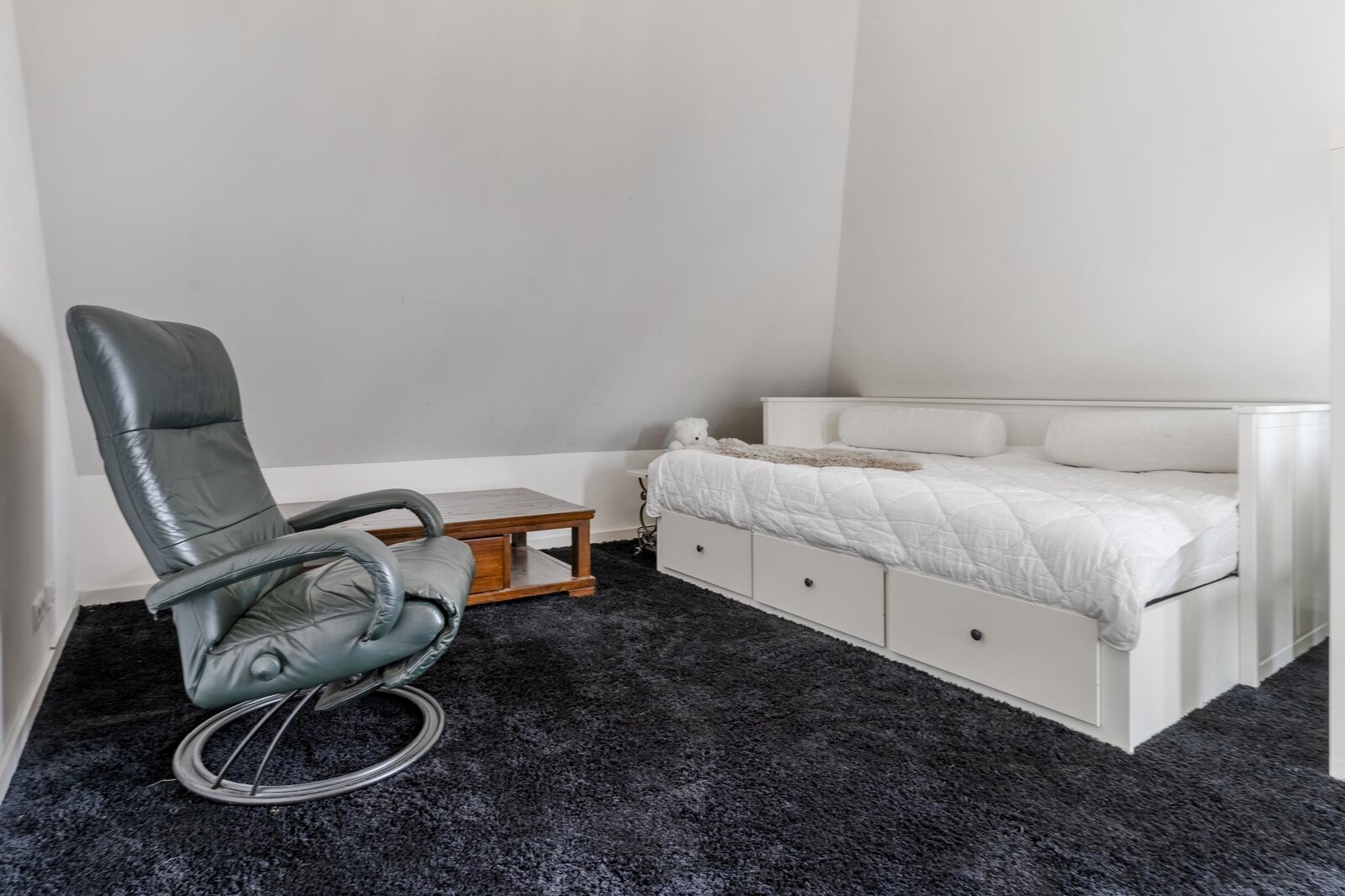 Trapopgang die direct uitkomt in de grote slaapkamer aan de achterzijde met bijbehorende tweede badkamer voorzien van douche, toilet en wastafel.
