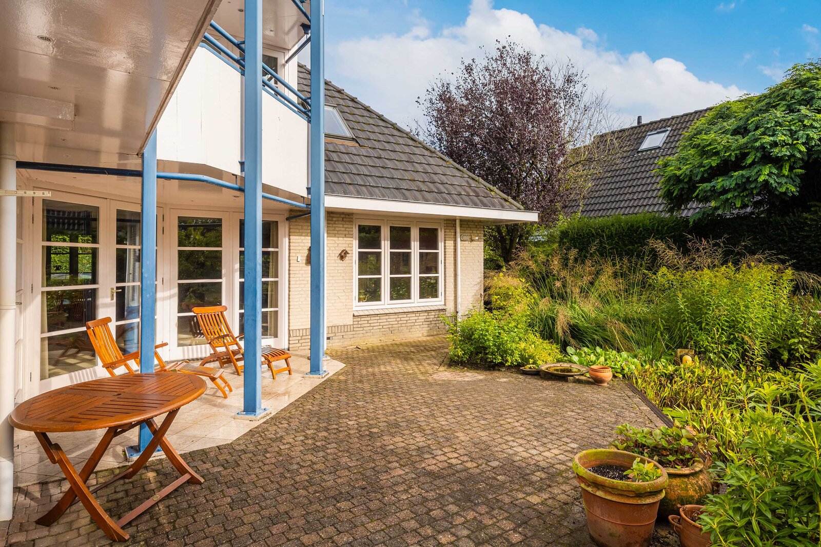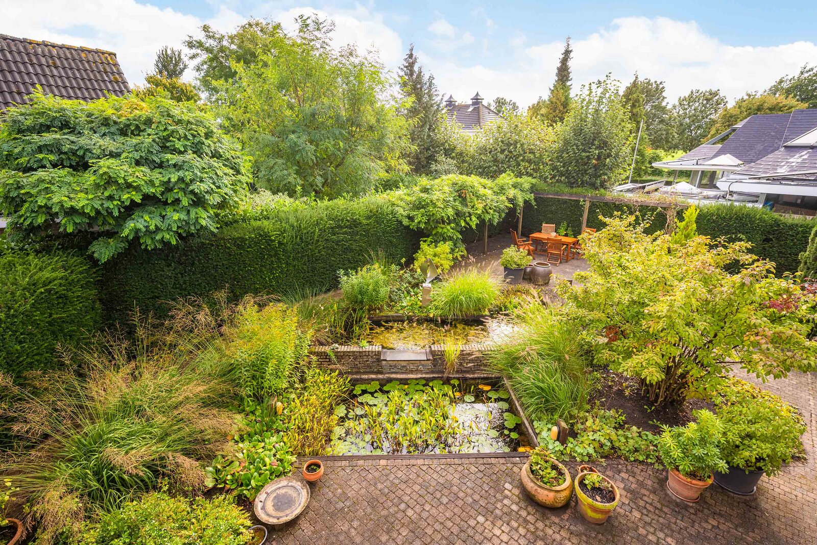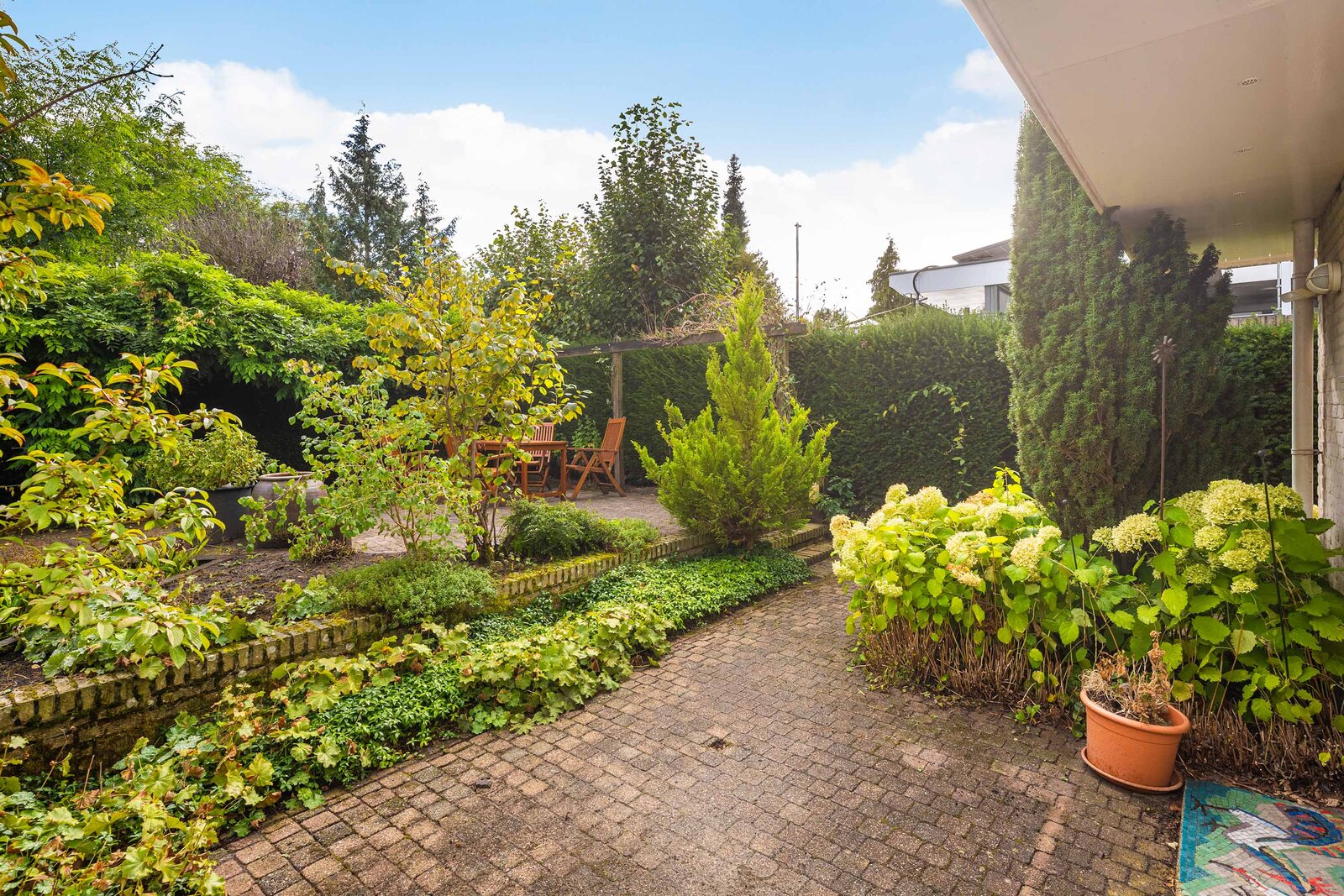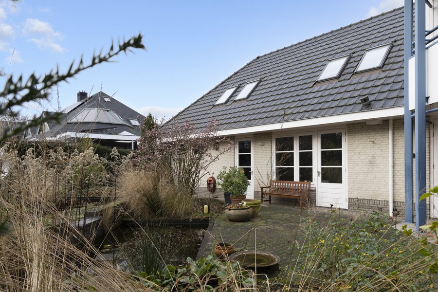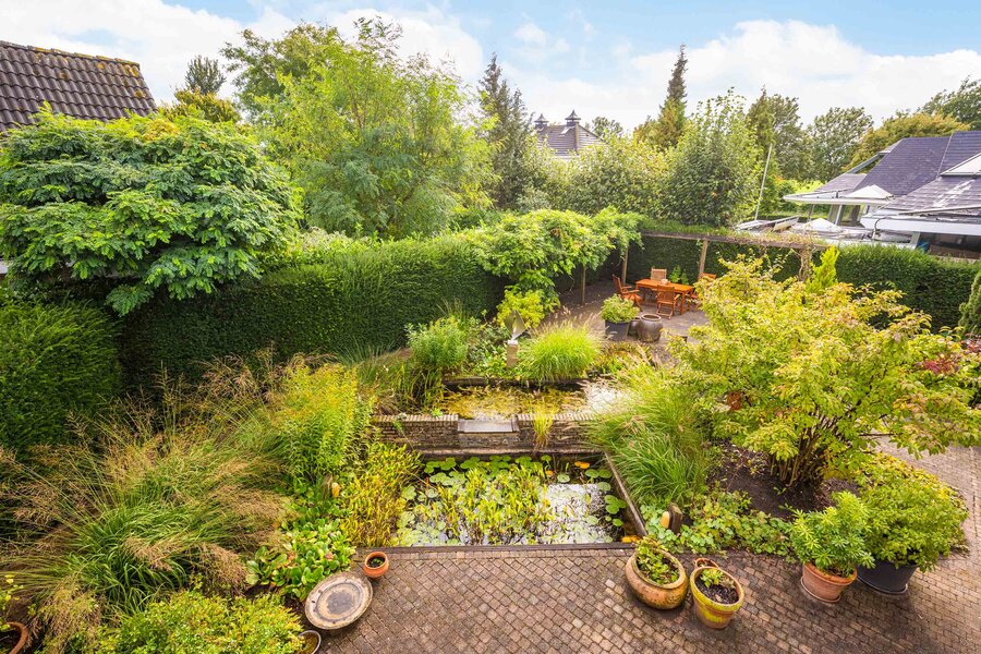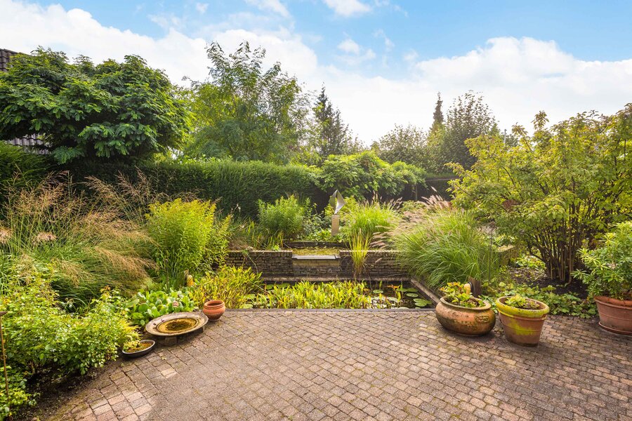 De tuin is fantastisch! Hier zit je omringd door prachtig groen, heerlijk in de zon. De tuin beschikt over veel privacy op het terras aan de achterzijde. Deze tuin is fraai aangelegd, met groene borders, een waterpartij en meerdere terrassen. Zo kun je altijd een schaduw- of zonplek opzoeken. De tuin ligt rondom het huis, de gehele tuin is verzorgd en netjes. Bovendien kun je voor de garage en aan de zijkant van de woning ook parkeren op eigen terrein.