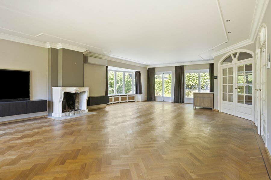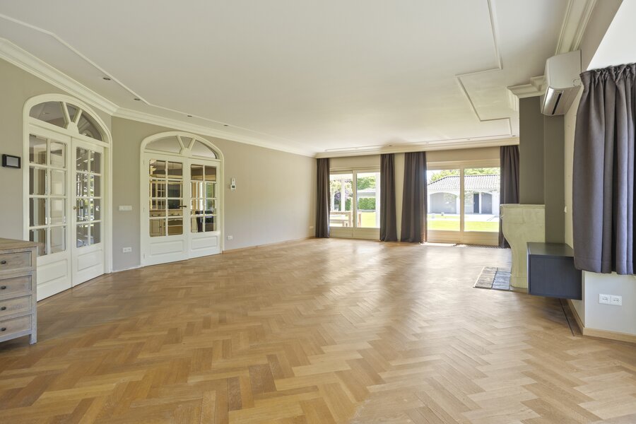 Vanuit de woonkamer en keuken geven meerdere schuifpuien toegang tot diverse terrassen aan zowel de voor- als achterzijde van de woning.