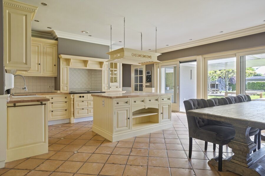 Dubbele deuren brengen ons naar de leefkeuken, het kloppend hart van de woning. Deze riante ruimte is ontworpen voor koken, tafelen en genieten. De keukenopstelling bestaat uit het centrale eiland, hoek opgestelde keuken en een kastenwand met diverse inbouwapparaten. Dit zorgt voor zowel sfeer als functionaliteit. Meerdere schuifpuien openen naar de overkapping, waardoor ook hier het buitengevoel onderdeel wordt van het dagelijks leven.
