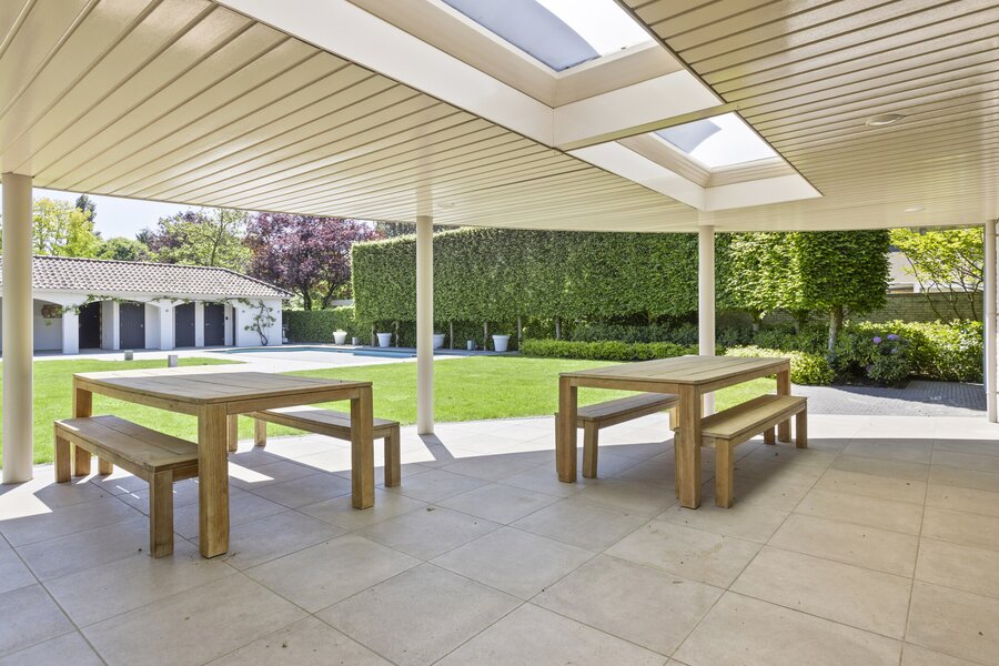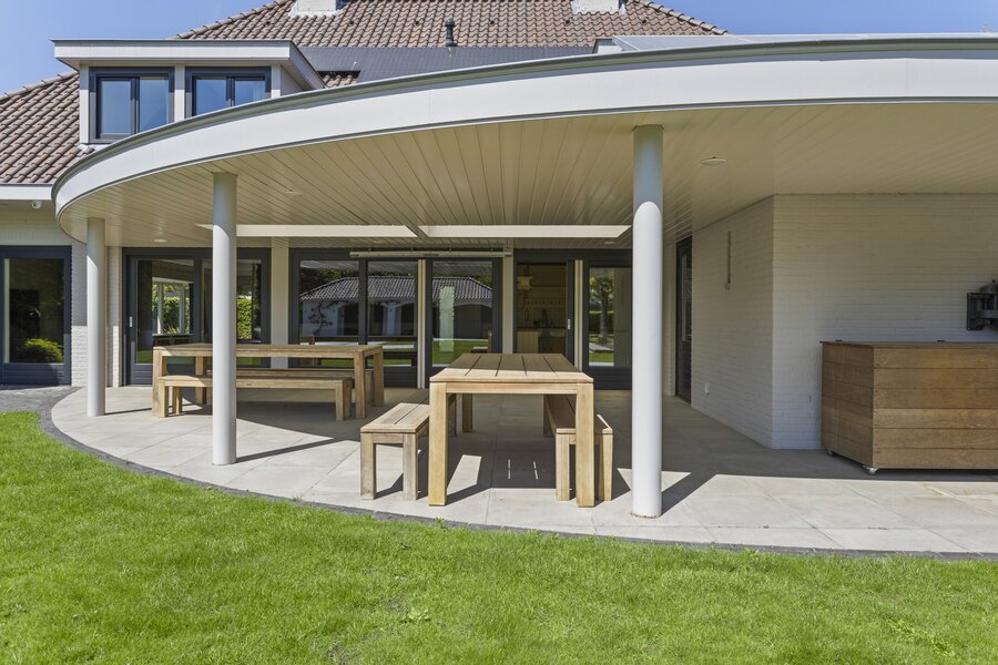 De riante overkapping, gelegen aan de achterzijde van de woning, geeft u een heerlijke plek om op warme dagen buiten met vrienden en familie te genieten van de lange zomeravonden.