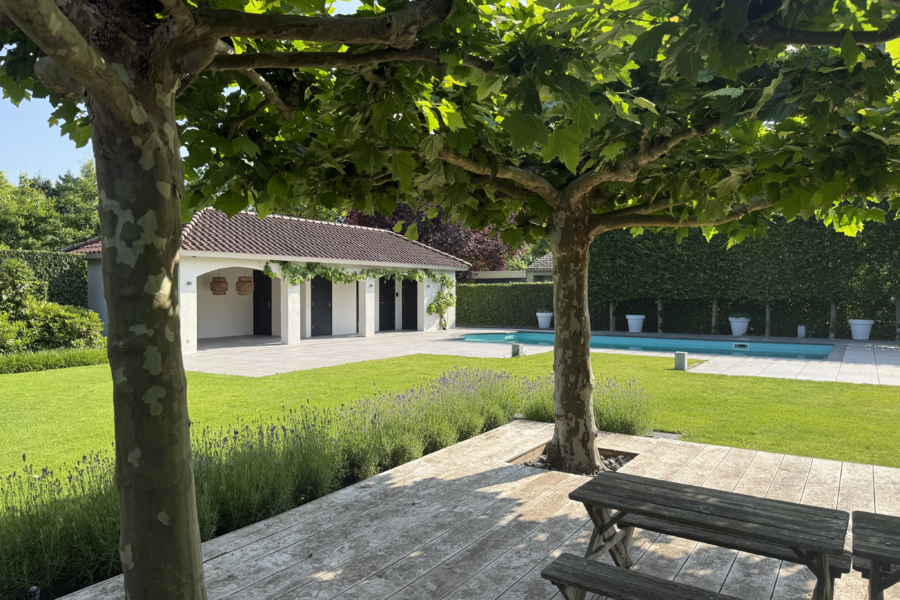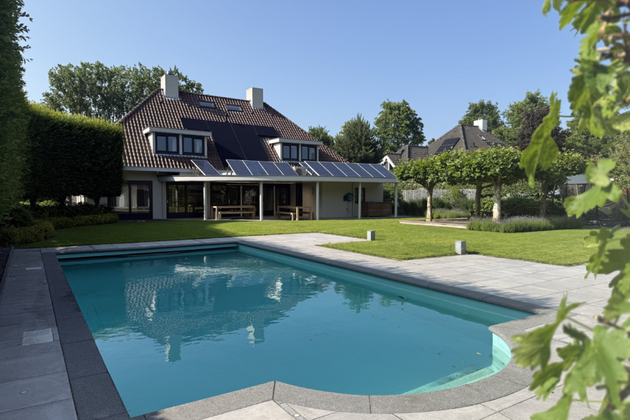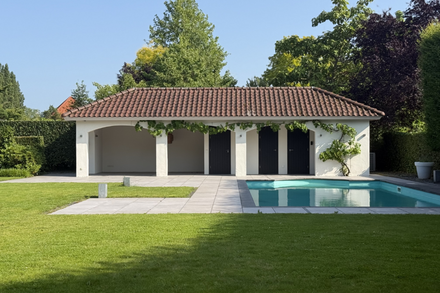 Het verwarmde zwembad vormt het middelpunt van de tuin, met daarnaast een volledig uitgerust poolhouse voorzien van douche, toilet, spoelruimte en bergruimte. De royale overkapping biedt het hele jaar door een beschutte plek om buiten te zitten en te genieten van het uitzicht over de tuin.