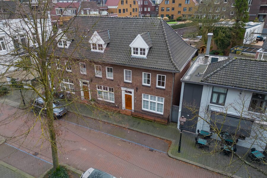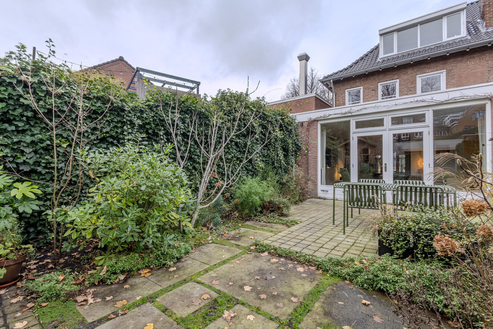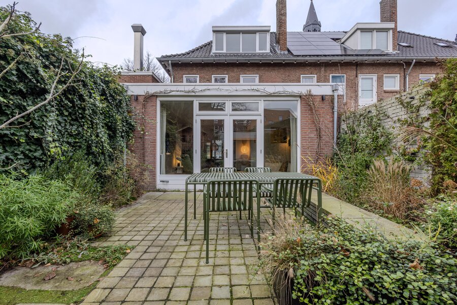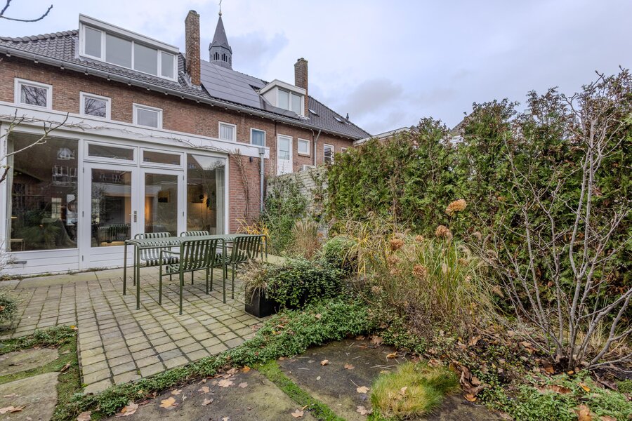 De achtertuin, gelegen op het zuiden, biedt een fijne buitenruimte met een royaal terras, een overkapping en volop volwassen groen. Er is een buitenkraan aanwezig en een praktische berging die toegang geeft tot de steeg. Deze steeg behoort tot het perceel en kent een recht van overpad voor de buren. Vanuit de steeg bereikt u eenvoudig de voorzijde van de woning.