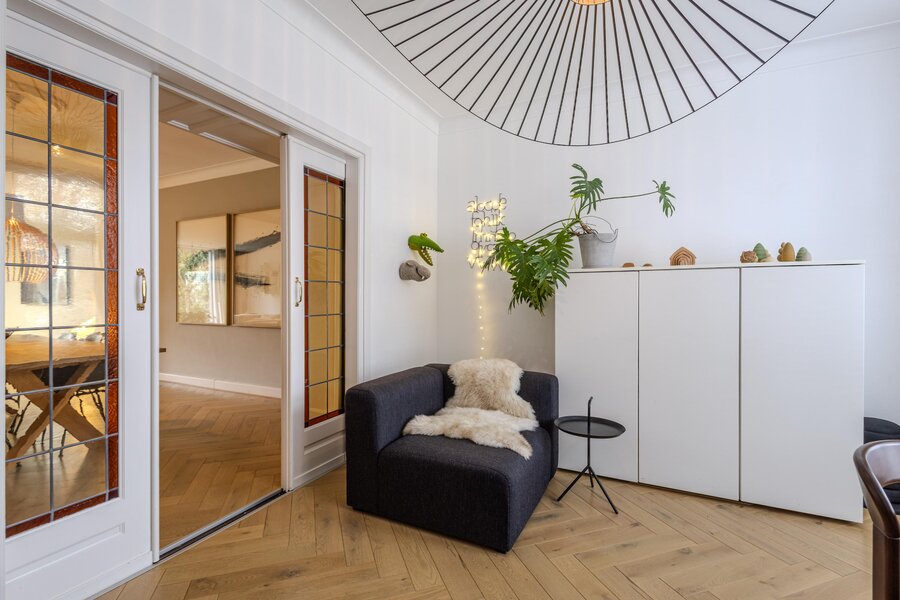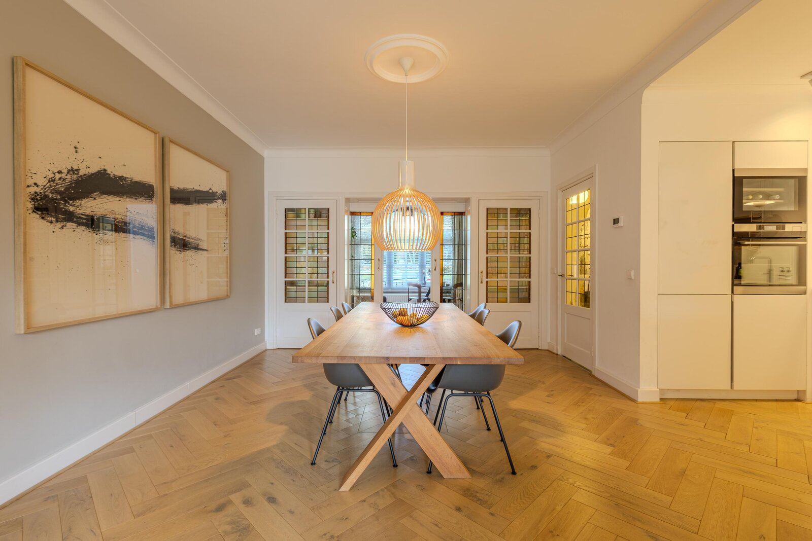 De voorkamer is een sfeervolle plek die zijn allure ontleent aan de twee glas-in-looddeuren. Via de tussendeur komt u in de eetkamer, eveneens voorzien van glas-in-lood en uitgerust met twee inbouwkasten met glas-in-looddetails.