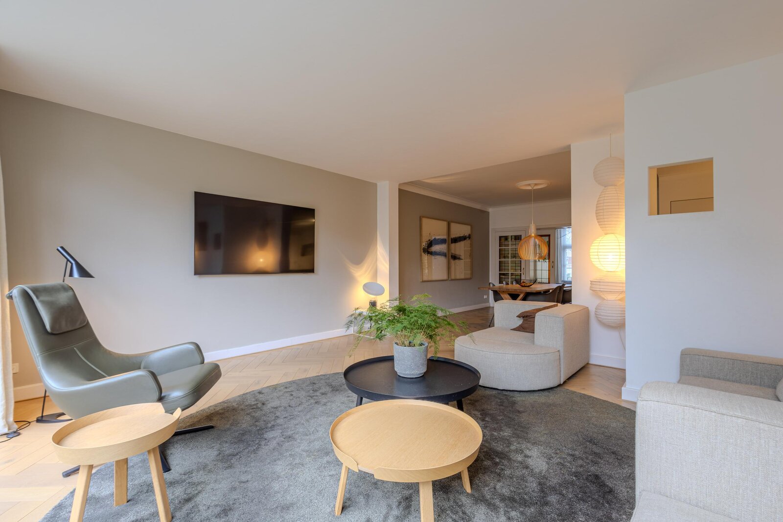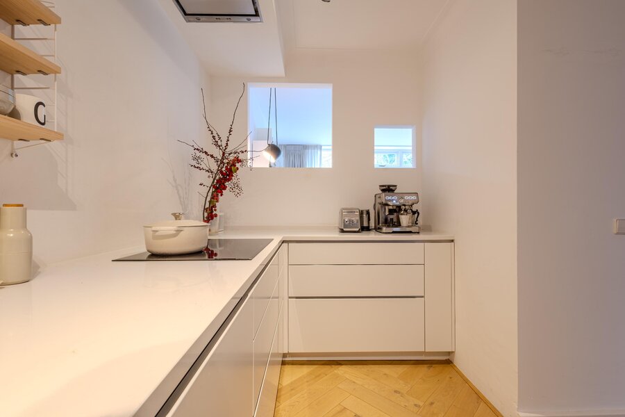 Aangrenzend ligt de halfopen keuken, uitgerust met een wijnkoeler, combi-stoomoven, Quooker, inductiekookplaat met vier zones, vriezer, koelkast, vaatwasser, afzuigkap en een composiet keukenblad.