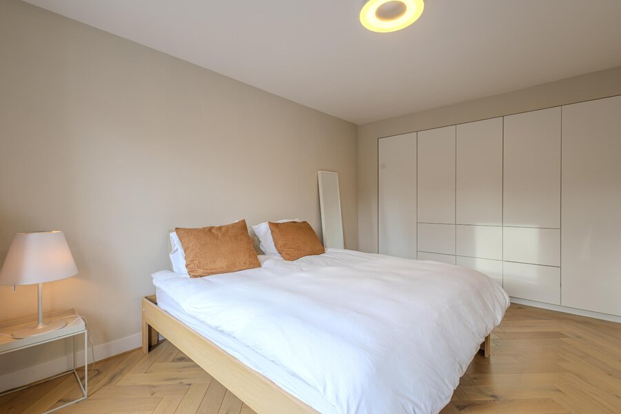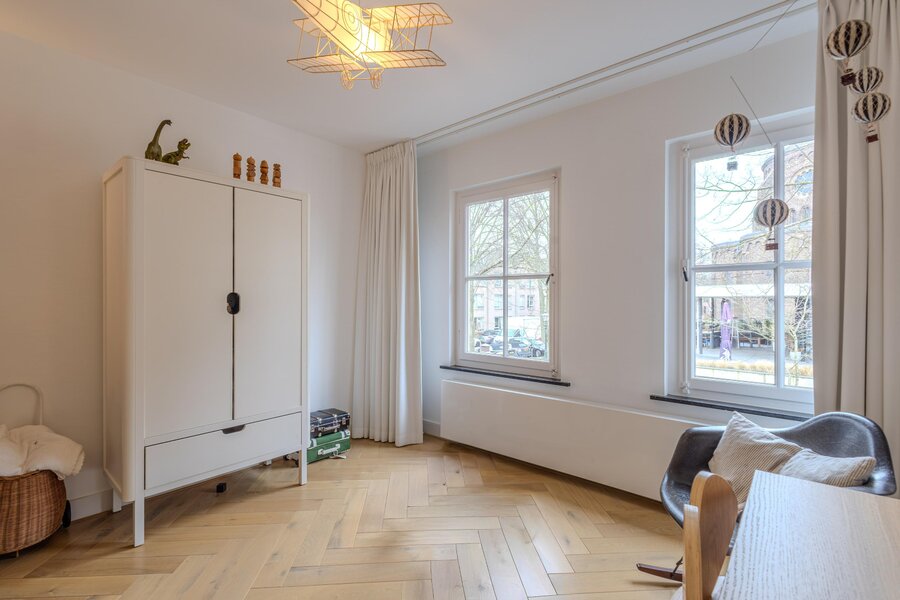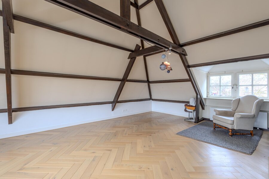 De gehele verdieping is afgewerkt met een eikenhouten visgraatvloer.
