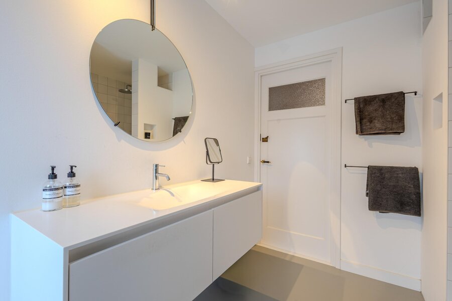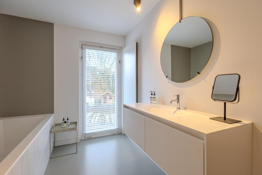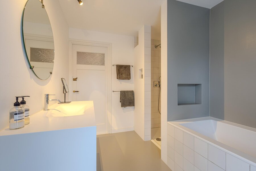 De badkamer is modern uitgevoerd en voorzien van een inloopdouche, een ligbad, een designradiator en een wastafel met meubel. De strak afgewerkte gietvloer geeft deze ruimte een bijzonder moderne en strakke uitstraling.