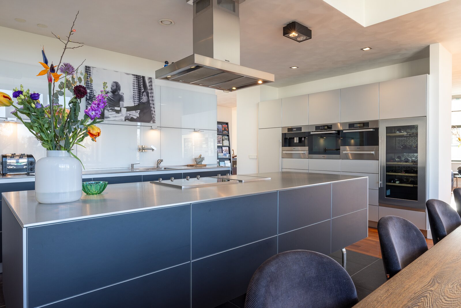 Aansluitend bevindt zich de ruime woonkeuken met kookeiland en een royale eetkameropstelling. De keuken is uitgevoerd met hoogwaardige inbouwapparatuur en vormt een vanzelfsprekend middelpunt voor zowel dagelijks gebruik als het ontvangen van gasten. De combinatie van de open indeling, de maatvoering en de lichtinval zorgt voor een bijzonder aangename leefruimte.