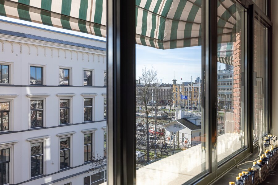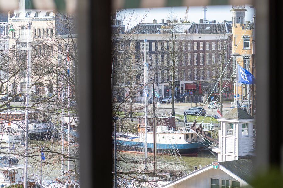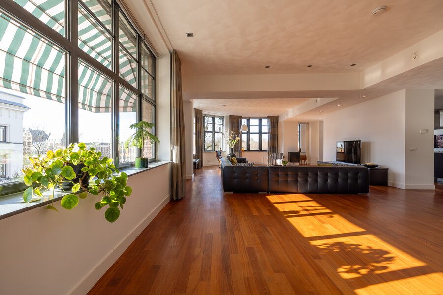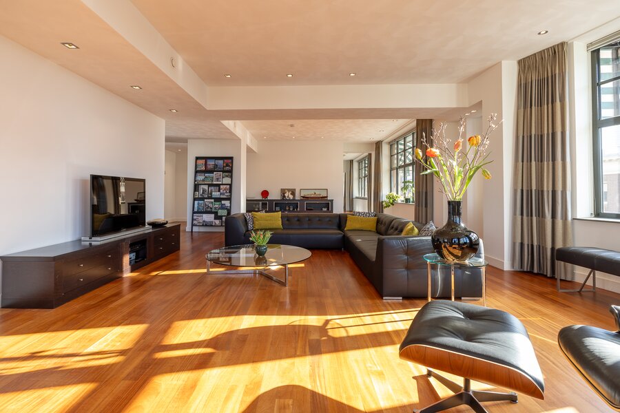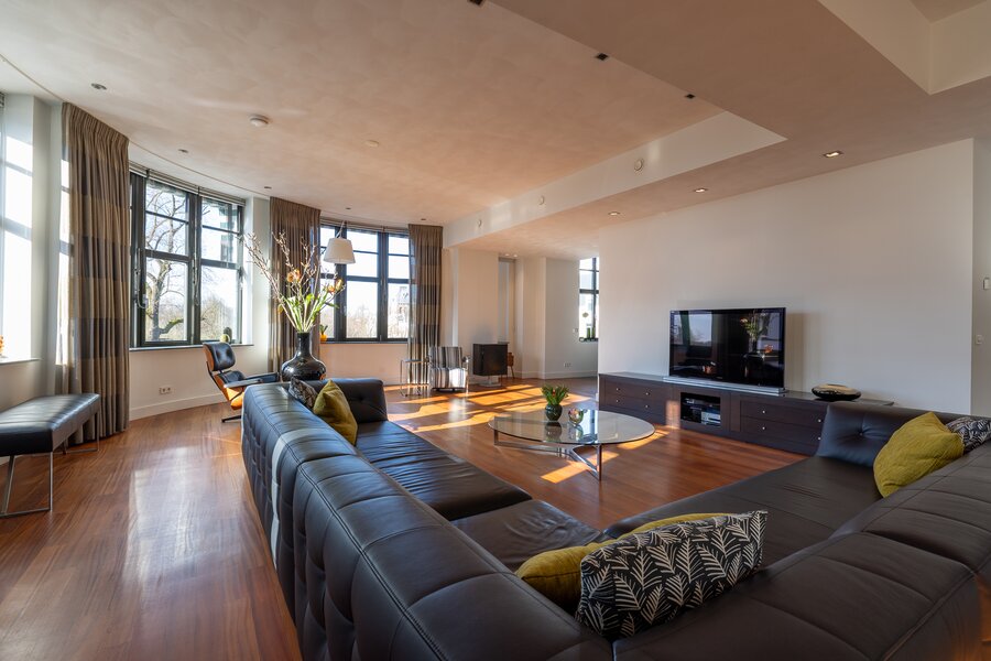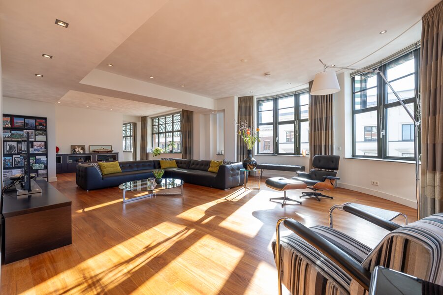 De woonruimte is indrukwekkend van maat en licht. Langs de elegante, licht gebogen gevel strekt zich een zeer royale living uit waar de grote raampartijen zorgen voor een prachtige lichtinval en een voortdurend zicht op de stad en het water. De ruimte biedt volop plaats voor meerdere zithoeken en vormt een bijzonder representatieve woonomgeving.