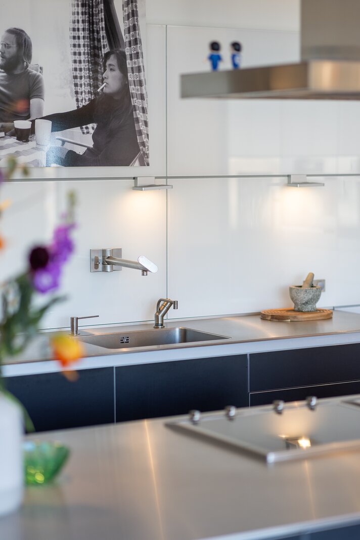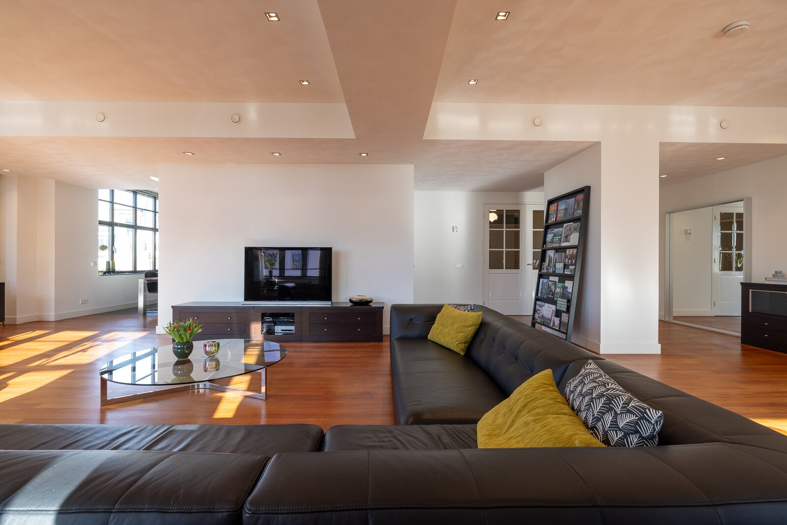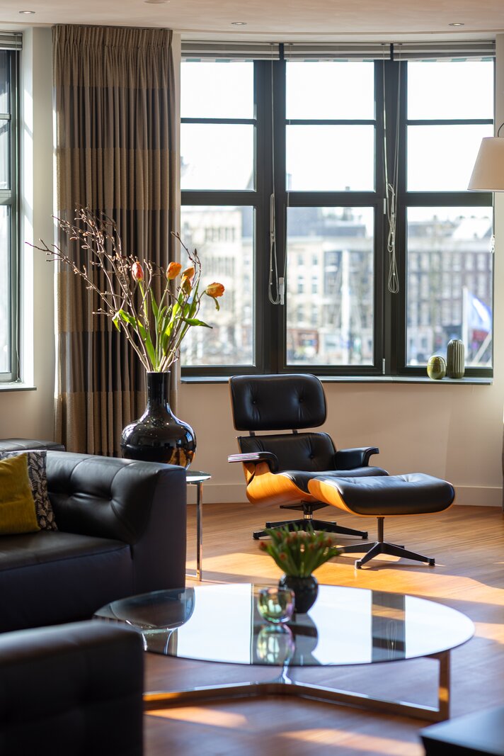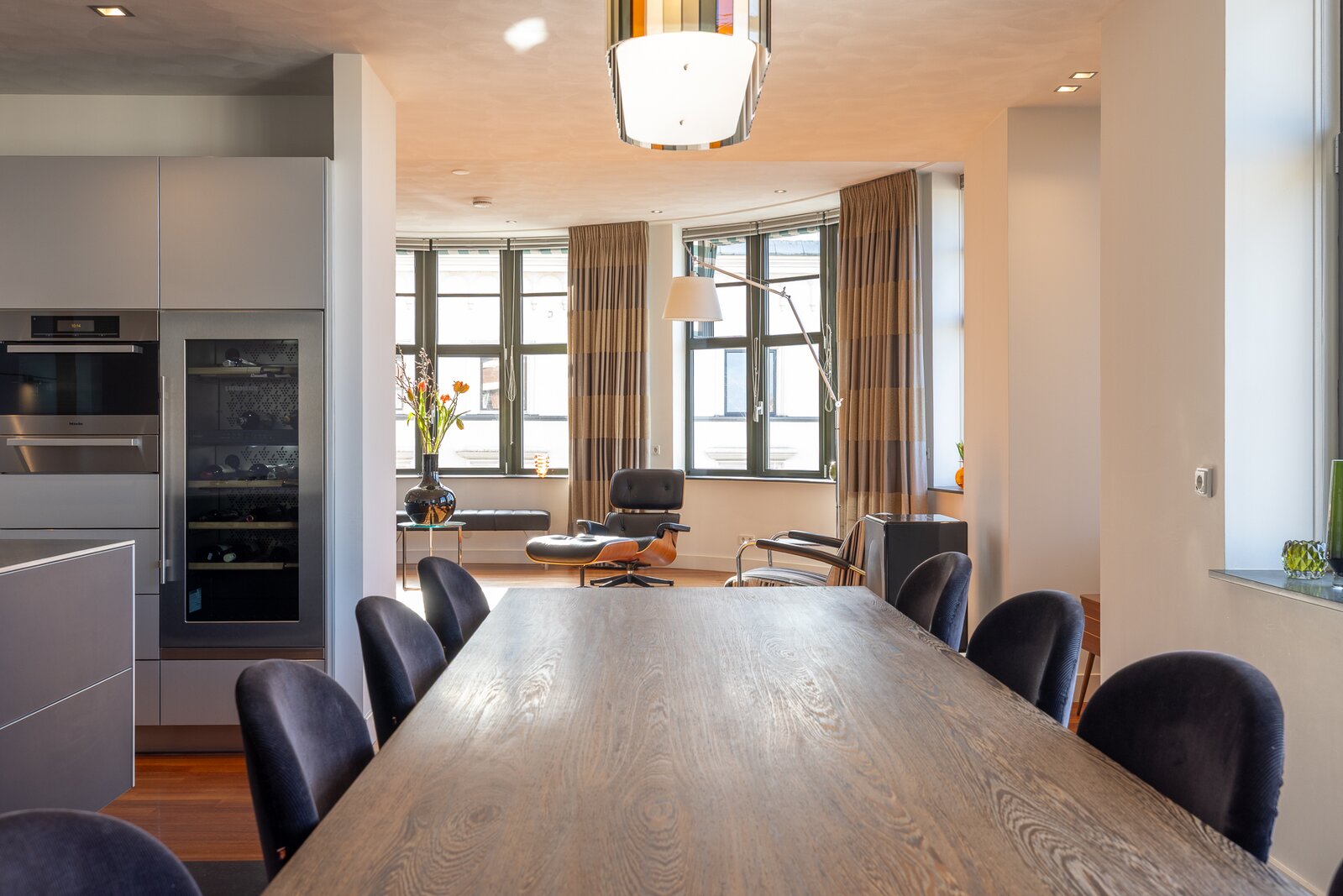 De woonruimte is indrukwekkend van maat en licht. Langs de elegante, licht gebogen gevel strekt zich een zeer royale living uit waar de grote raampartijen zorgen voor een prachtige lichtinval en een voortdurend zicht op de stad en het water. De ruimte biedt volop plaats voor meerdere zithoeken en vormt een bijzonder representatieve woonomgeving.