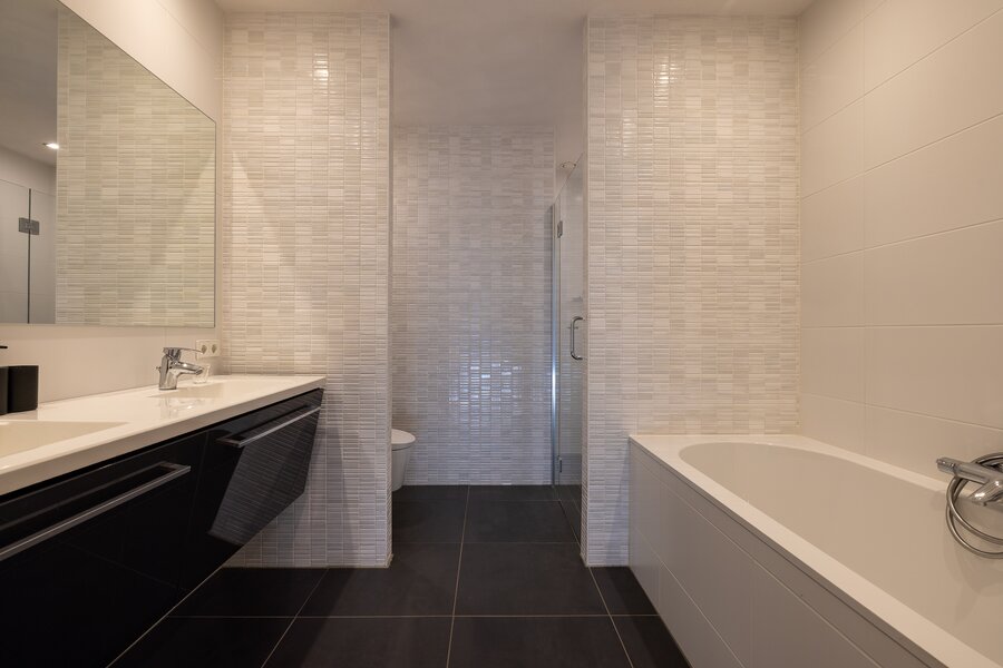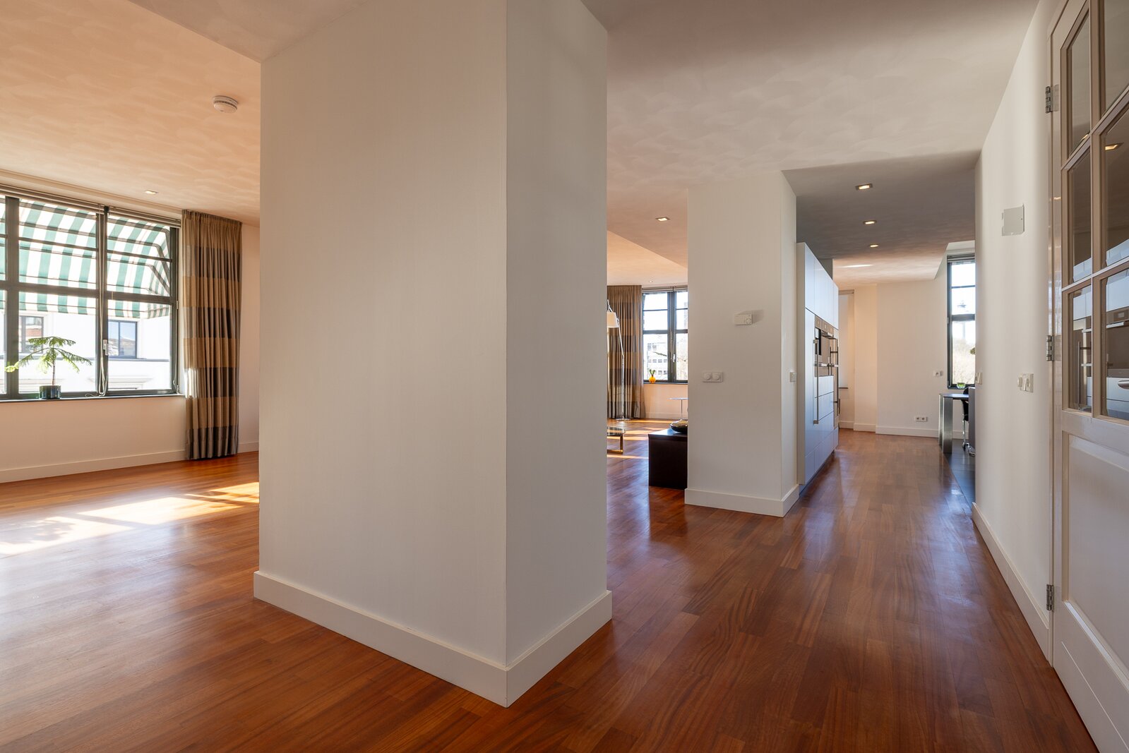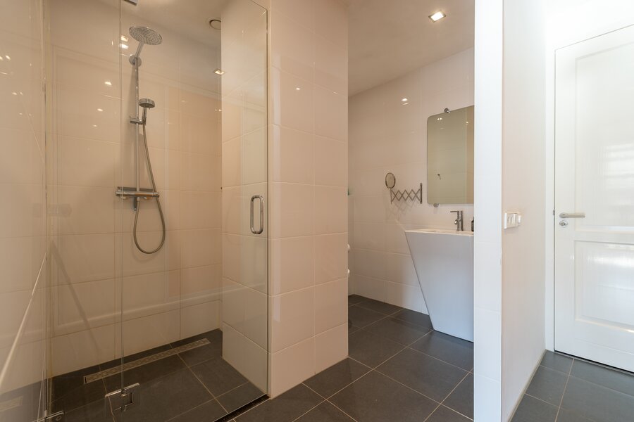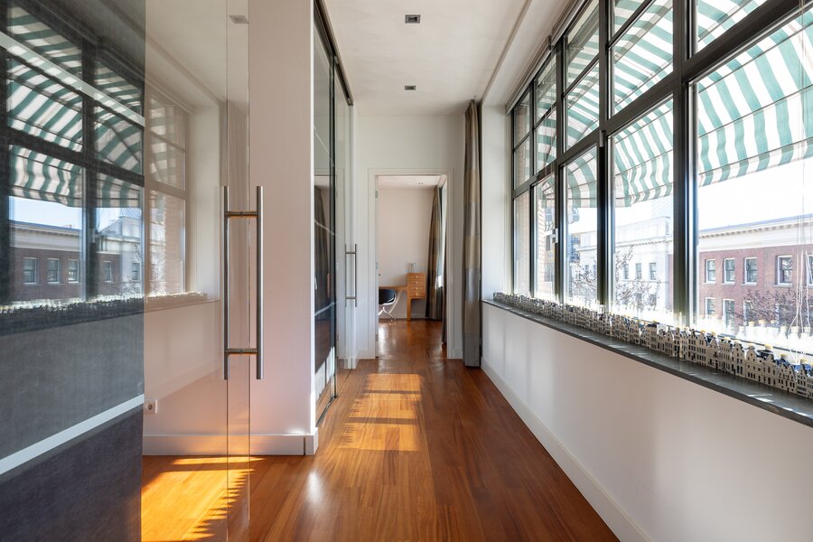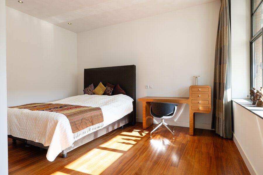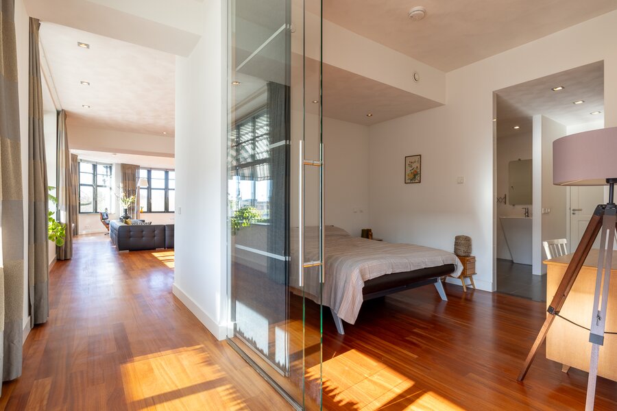 Aan de meer rustige zijde van het appartement bevinden zich de slaapvertrekken. De hoofdslaapkamer beschikt over een royale inloopkast en een zeer ruime badkamer met ligbad, dubbele wastafel en een inloopdouche. Daarnaast is er nog een slaapkamer, een tweede badkamer en een separate werkkamer, waardoor het appartement een bijzonder comfortabele en veelzijdige indeling heeft.