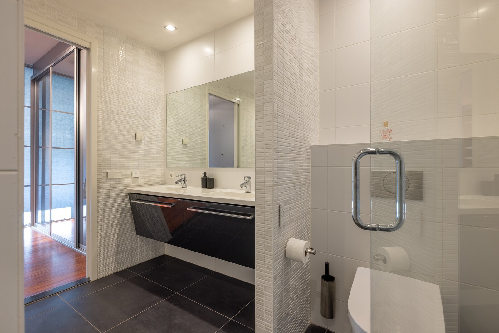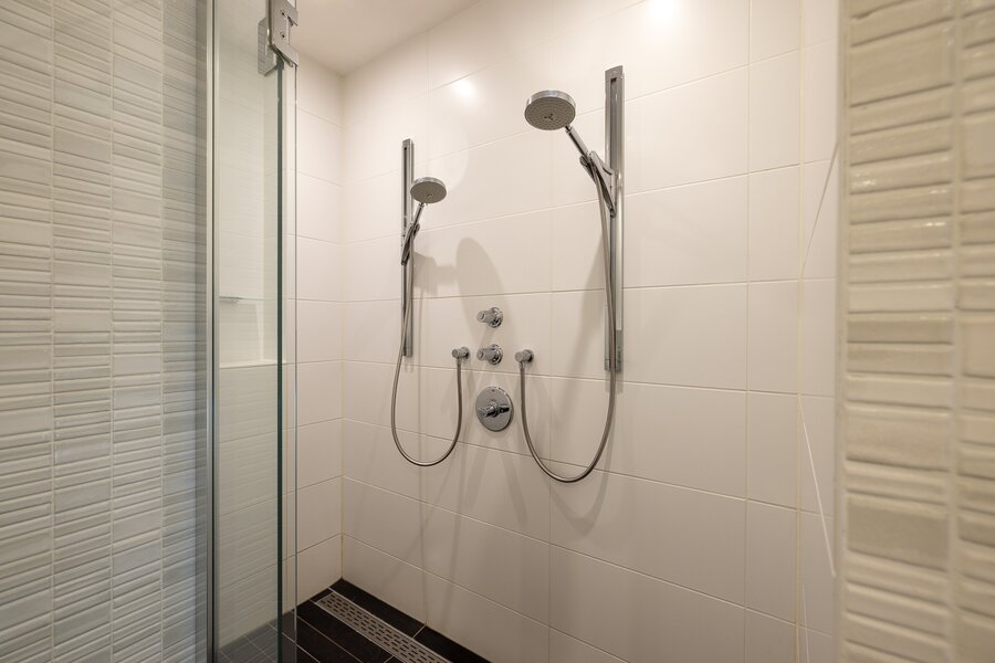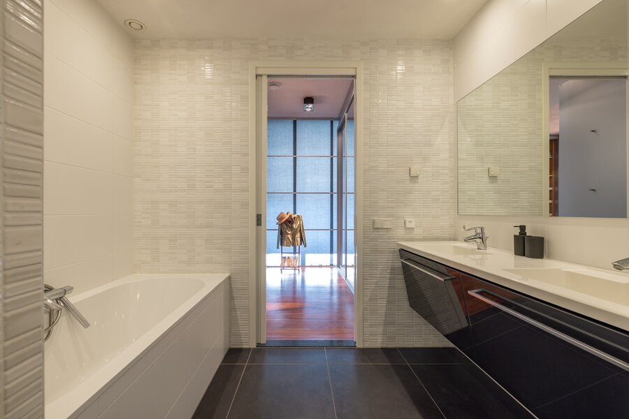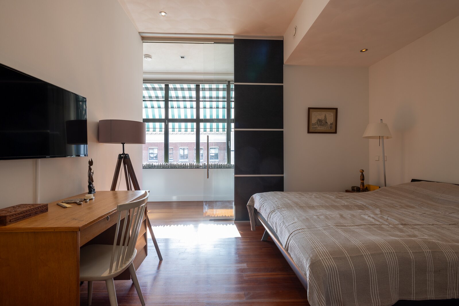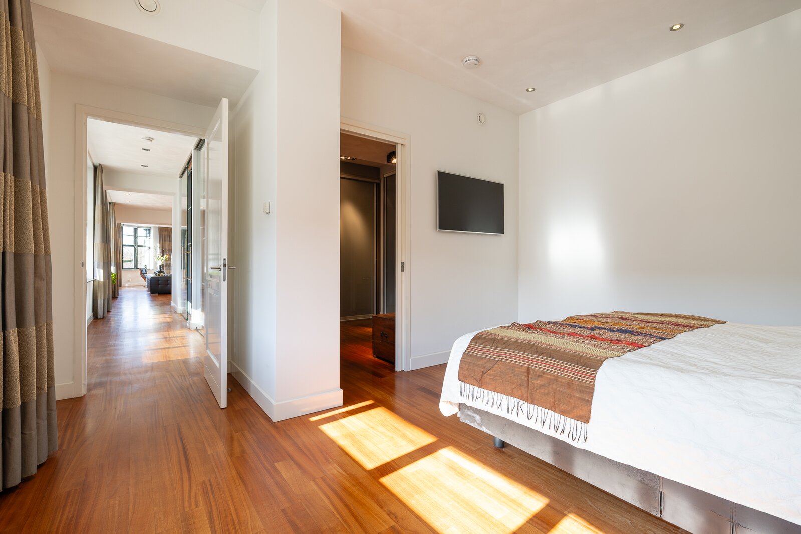 Aan de meer rustige zijde van het appartement bevinden zich de slaapvertrekken. De hoofdslaapkamer beschikt over een royale inloopkast en een zeer ruime badkamer met ligbad, dubbele wastafel en een inloopdouche. Daarnaast is er nog een slaapkamer, een tweede badkamer en een separate werkkamer, waardoor het appartement een bijzonder comfortabele en veelzijdige indeling heeft.