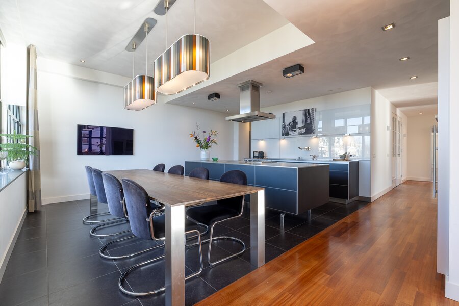 Entrance, spacious hall and corridor with wardrobe, toilet with washbasin, very generous living room with beautiful curved bay window, large windows and views over the Veerhaven, spacious open-plan kitchen with views of the park and the Euromast and a luxurious Bulthaup kitchen with cooking island and all conceivable built-in appliances, utility room with technical installations, corridor, bedroom with en-suite bathroom equipped with walk-in shower, toilet and washbasin, generous master bedroom with adjoining walk-in wardrobe (formerly a bedroom) and a luxurious en-suite bathroom with bathtub, double washbasin unit, double shower and toilet, hallway, storage room, study with pantry and separate entrance.