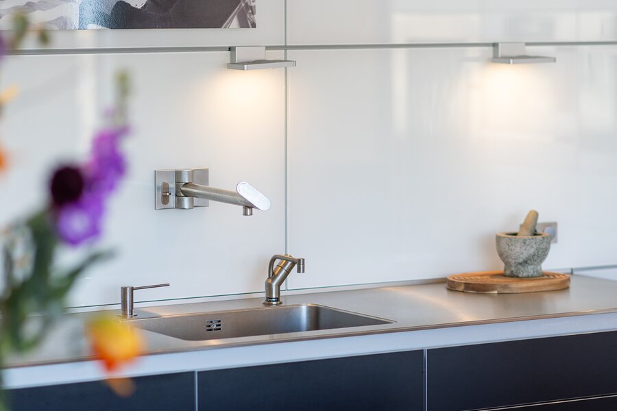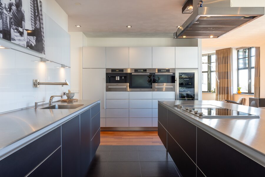 Adjacent is the spacious open-plan kitchen with cooking island and a generous dining area. The kitchen is fitted with high-quality built-in appliances and naturally serves as the heart of the home for both daily living and entertaining guests. The combination of the open layout, generous dimensions and natural light creates a particularly pleasant living space.