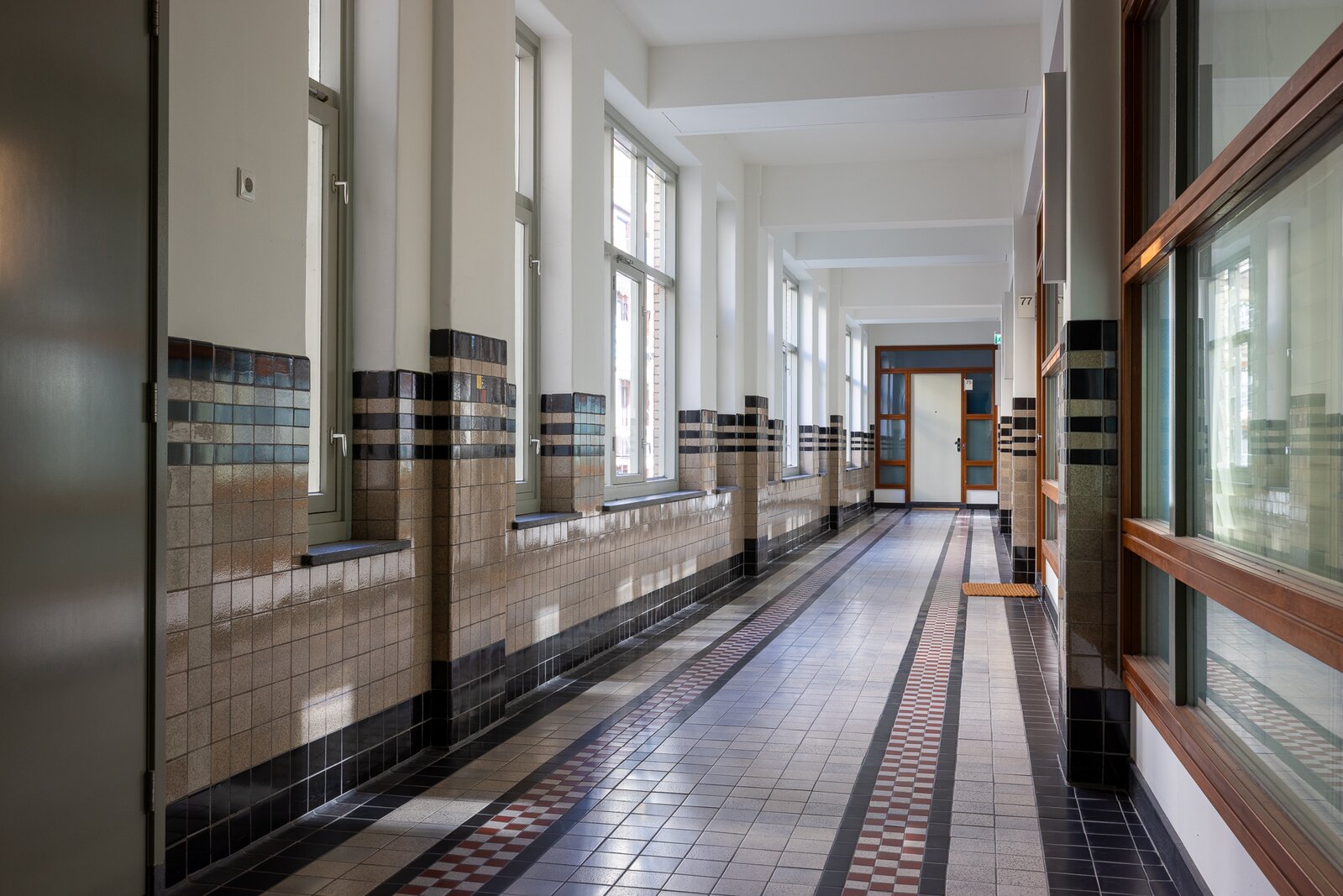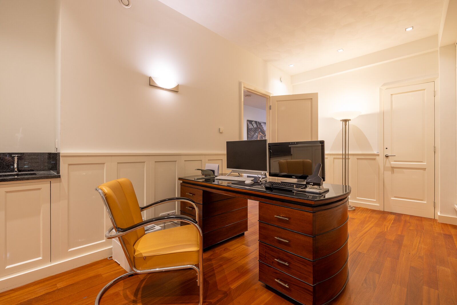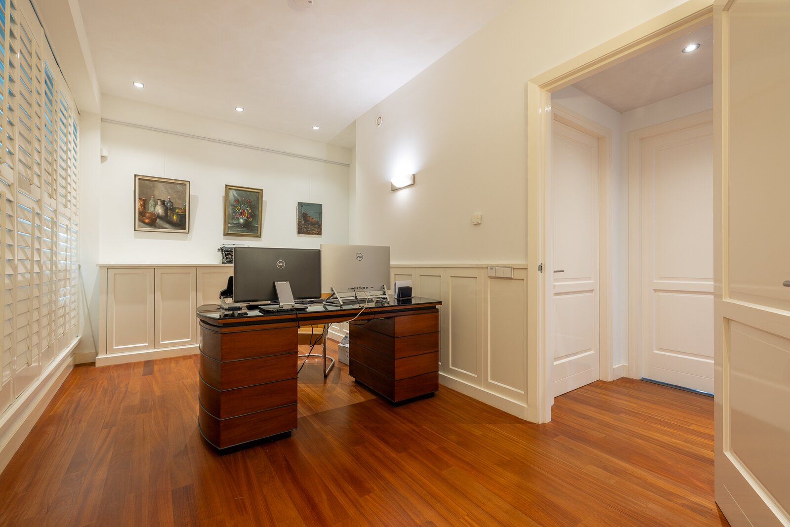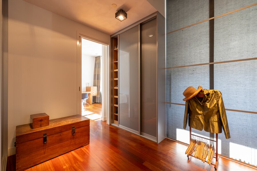 The apartment was created by merging two residences and still retains two house numbers and two separate entrances. This offers remarkable flexibility of use and makes the property particularly suitable for a live-work combination, a home office, or a layout with a self-contained guest accommodation.