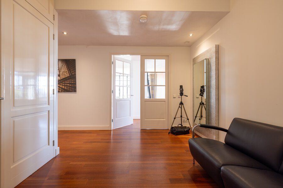 Het appartement is ontstaan uit de samenvoeging van twee woningen en beschikt nog altijd over twee huisnummers en twee afzonderlijke entrees. Hierdoor biedt het een bijzondere flexibiliteit in gebruik en leent het zich bij uitstek voor een woon-werkcombinatie, een kantoor aan huis of een indeling met een zelfstandig gastenverblijf.