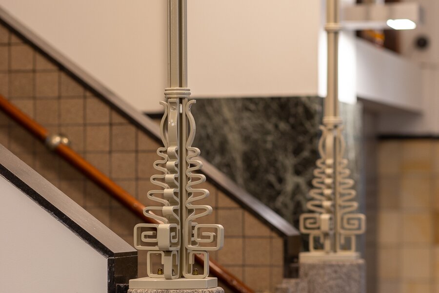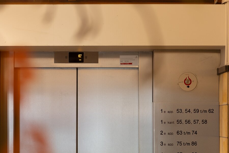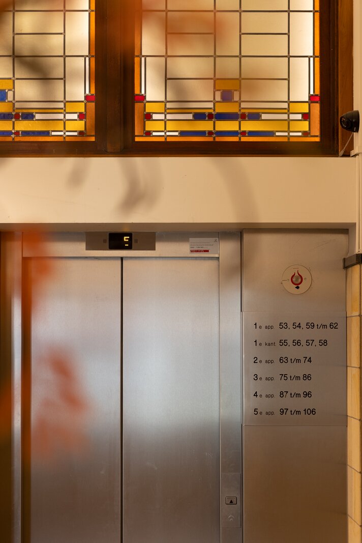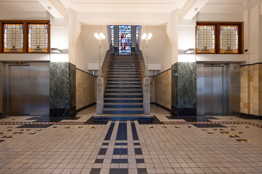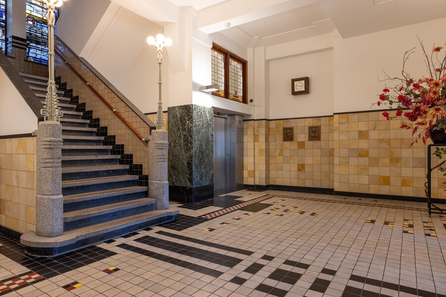 Representative central entrance at Westplein with video intercom. Monumental hall with elevators and access to the storage rooms and parking garage.