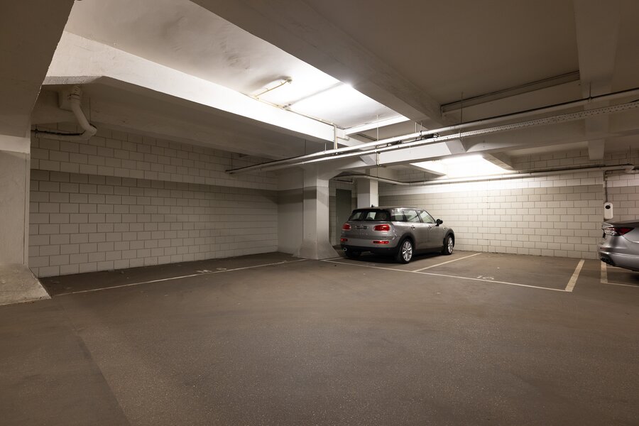 Bij het appartement behoren een externe berging en drie parkeerplaatsen in de ondergelegen parkeergarage: twee reguliere parkeerplaatsen en een kleinere parkeerplaats geschikt voor een compacte auto of motor.