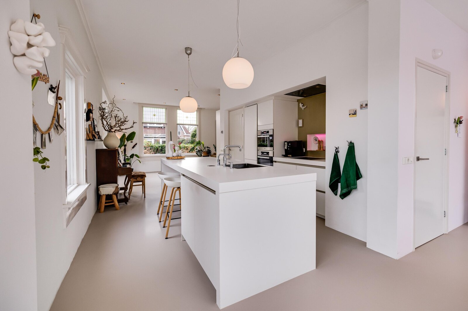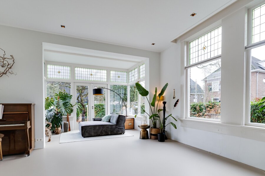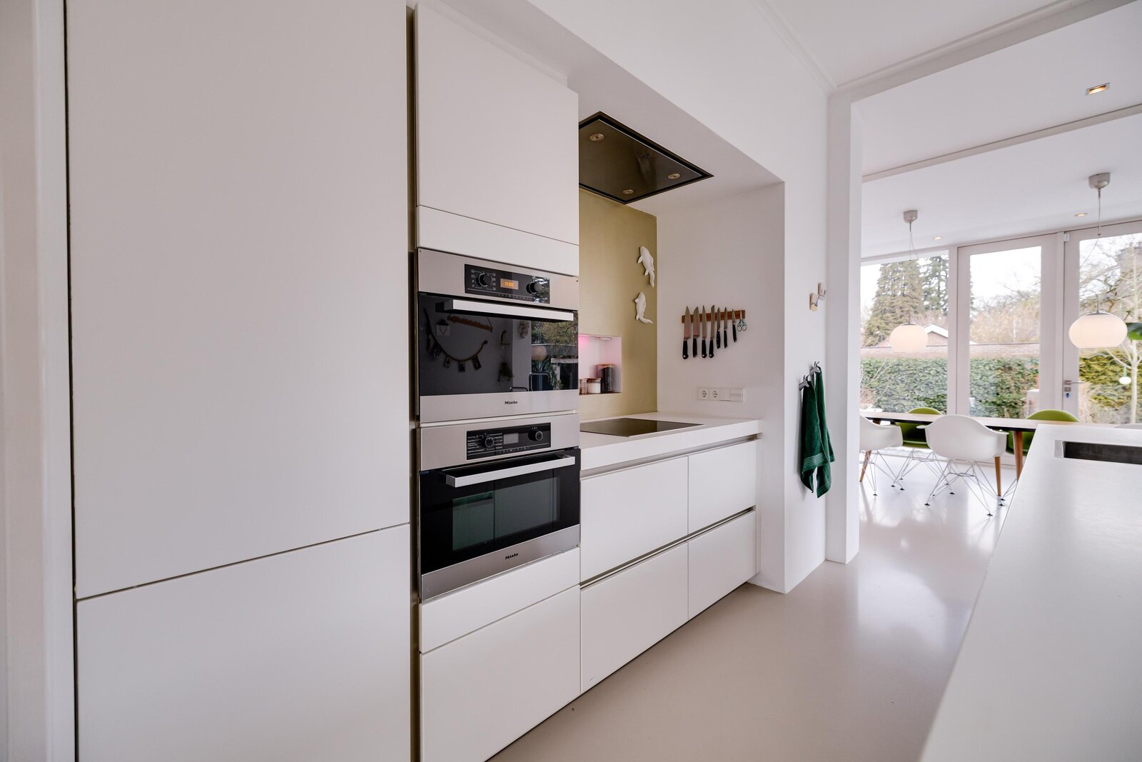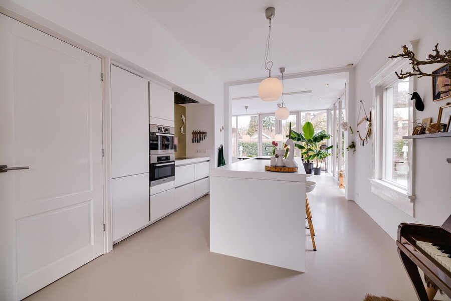 De sfeervolle woonkamer aan de voorzijde, met een houtkachel en prachtige lichtinval door de originele glas-in-lood ramen, gaat naadloos over in de serre met openslaande deuren naar de tuin. De absolute eyecatcher is echter de royale uitbouw aan de achterzijde uit 2011. Hier is de spectaculaire woonkeuken gerealiseerd, het hart van het huis. Deze luxe keuken is voorzien van alle denkbare A-merk inbouwapparatuur, met een stoomoven, combi-oven, inductiekookplaat, Quooker, vaatwasser en een grote koelkast met 0-graden zone. De uitbouw heeft aan twee zijden openslaande deuren naar de tuin en een ingebouwde gashaard. Vanuit de keuken bereikt u de praktische bijkeuken met volop bergruimte en plek voor vriezer, wasmachine en droger. Daarnaast is er een royale kelder. De gehele begane grond is voorzien van comfortabele vloerverwarming.