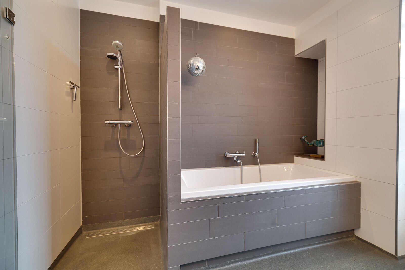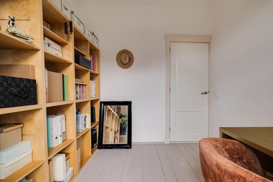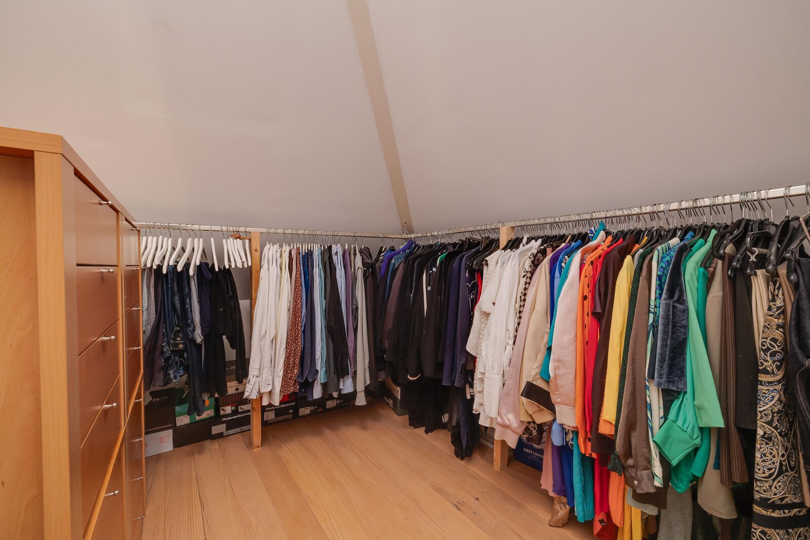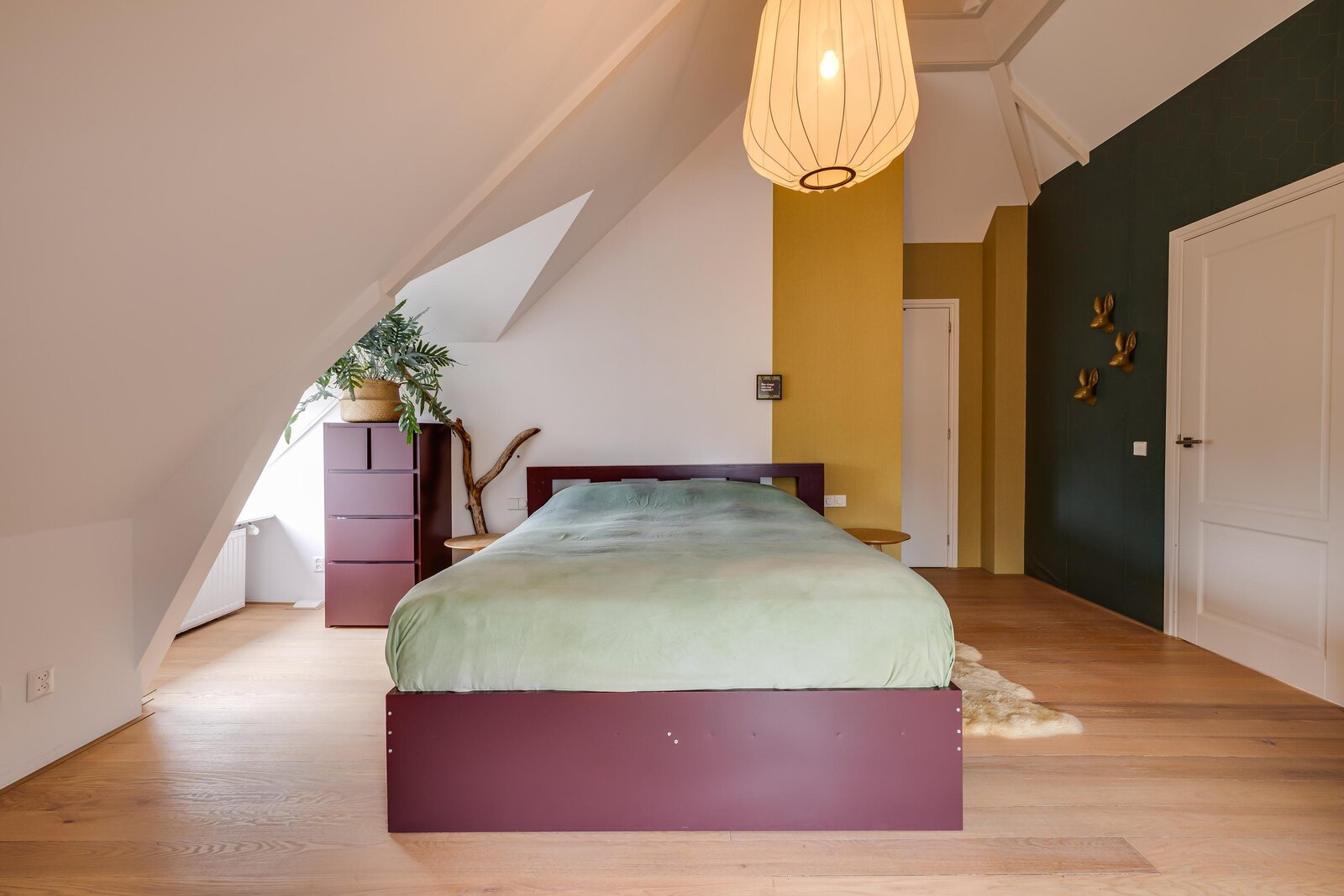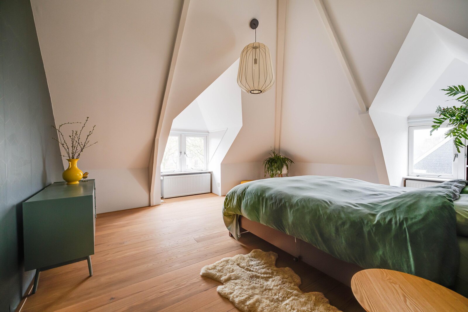 Tweede verdieping (Zolder). Vanaf de overloop komt u in de riante hoofdslaapkamer, afgewerkt met een schitterende eikenhouten vloer en een royale inloopkast. De complete badkamer op deze verdieping is voorzien van vloerverwarming, een dubbele wastafel, een wandcloset en een ruime inloopdouche. Dit is een verdieping die rust, ruimte en luxe ademt. De overloop biedt ook toegang tot een berging en tot de technische ruimte waar de CV-opstelling en de warmtepomp zijn geïnstalleerd.
