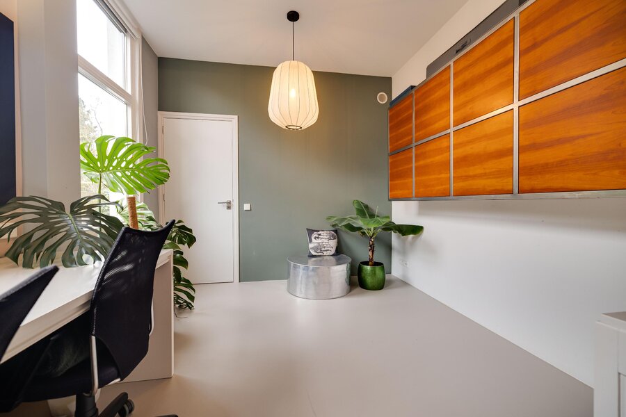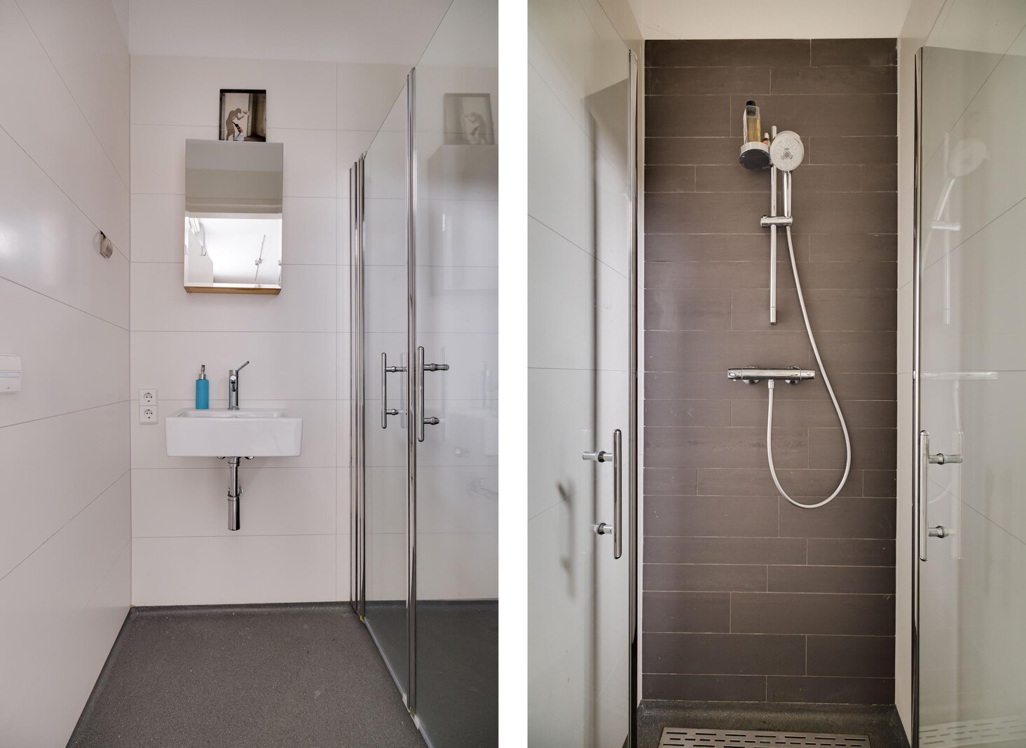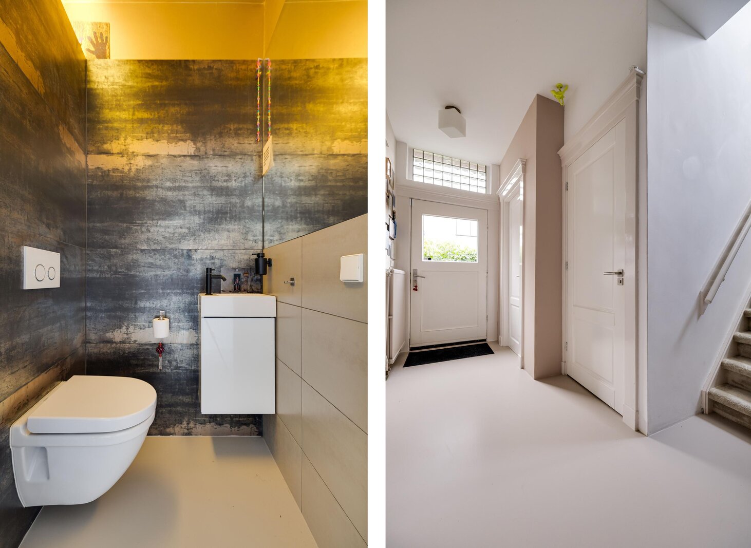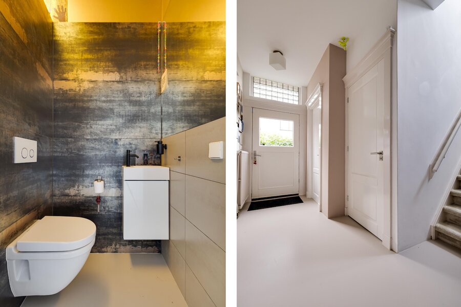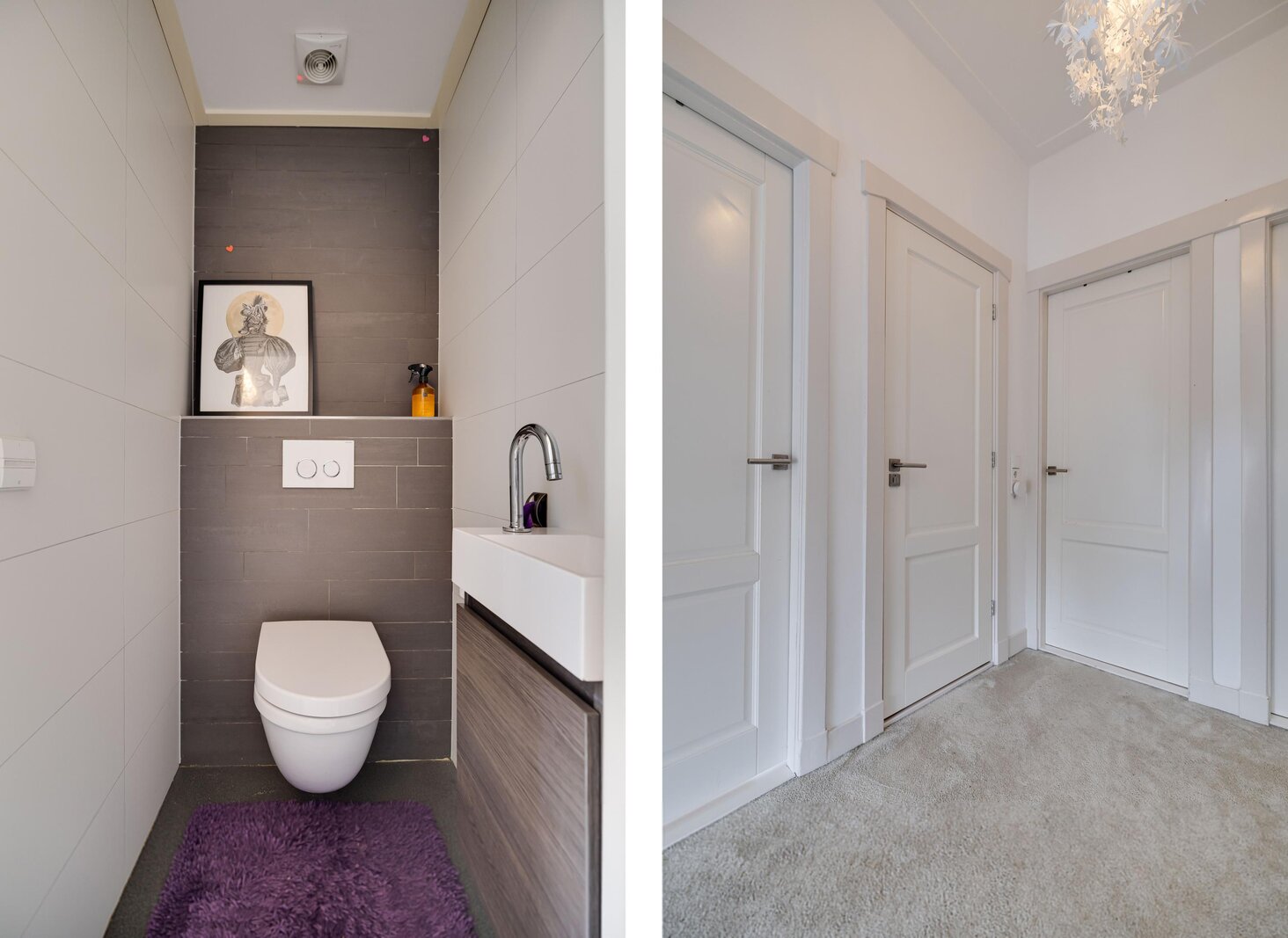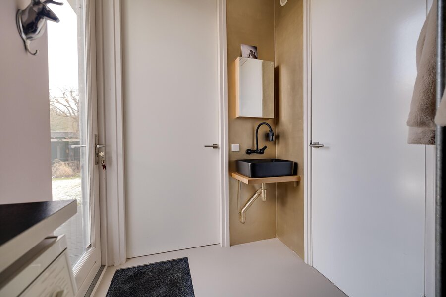 U komt binnen in de royale hal met trapopgang naar de eerste verdieping. Vanuit de hal heeft u ook toegang tot een praktische slaapkamer/werkkamer met een eigen douche en wastafel en, tot een modern toilet.