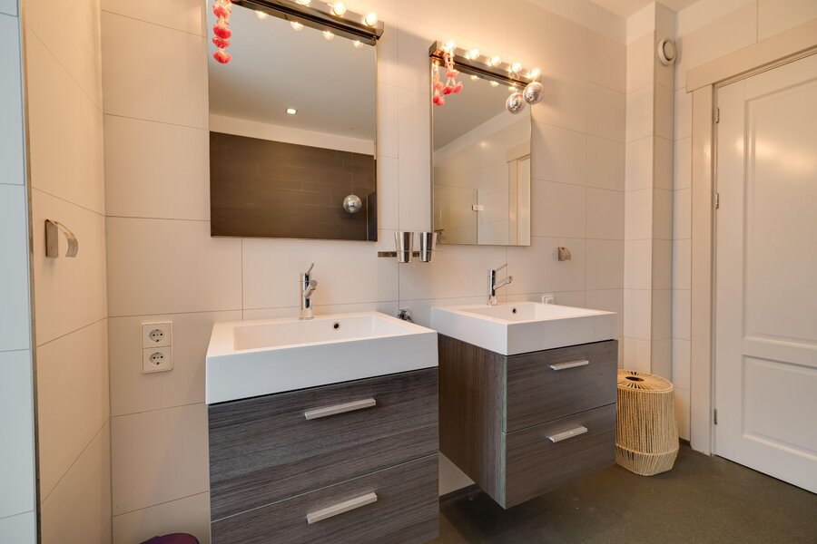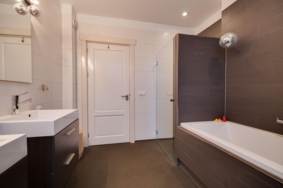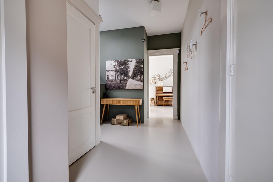 Eerste verdieping De overloop geeft toegang tot maar liefst vier ruime slaapkamers, een badkamer en een separaat toilet. Eén slaapkamer beschikt over een eigen wastafel en twee andere kamers hebben een charmant balkon met uitzicht op de groene omgeving. De badkamer op deze verdieping is uitgerust met een ligbad, een dubbele wastafel, een royale inloopdouche en is voorzien van vloerverwarming.