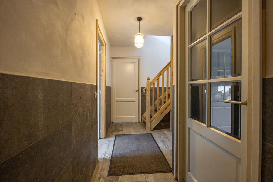 Vanuit de woonkamer bereikt u de overloop, waar een separate toiletruimte en een deur naar buiten aanwezig zijn. Daarnaast bevindt zich op deze verdieping een tweede slaapkamer of multifunctionele ruimte, met aan zowel de voor- als achterzijde een deur naar buiten en een eigen wastafel.