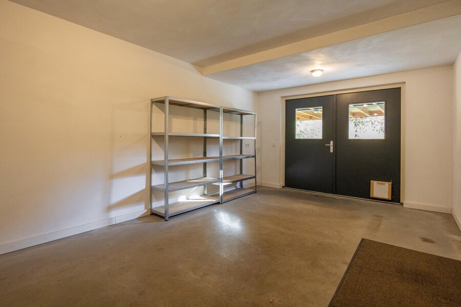 De garage biedt plaats aan één auto en is tevens de locatie van de warmtepomp en de installatie voor de vloerverwarming. De gehele begane grond is afgewerkt met een betegelde vloer.