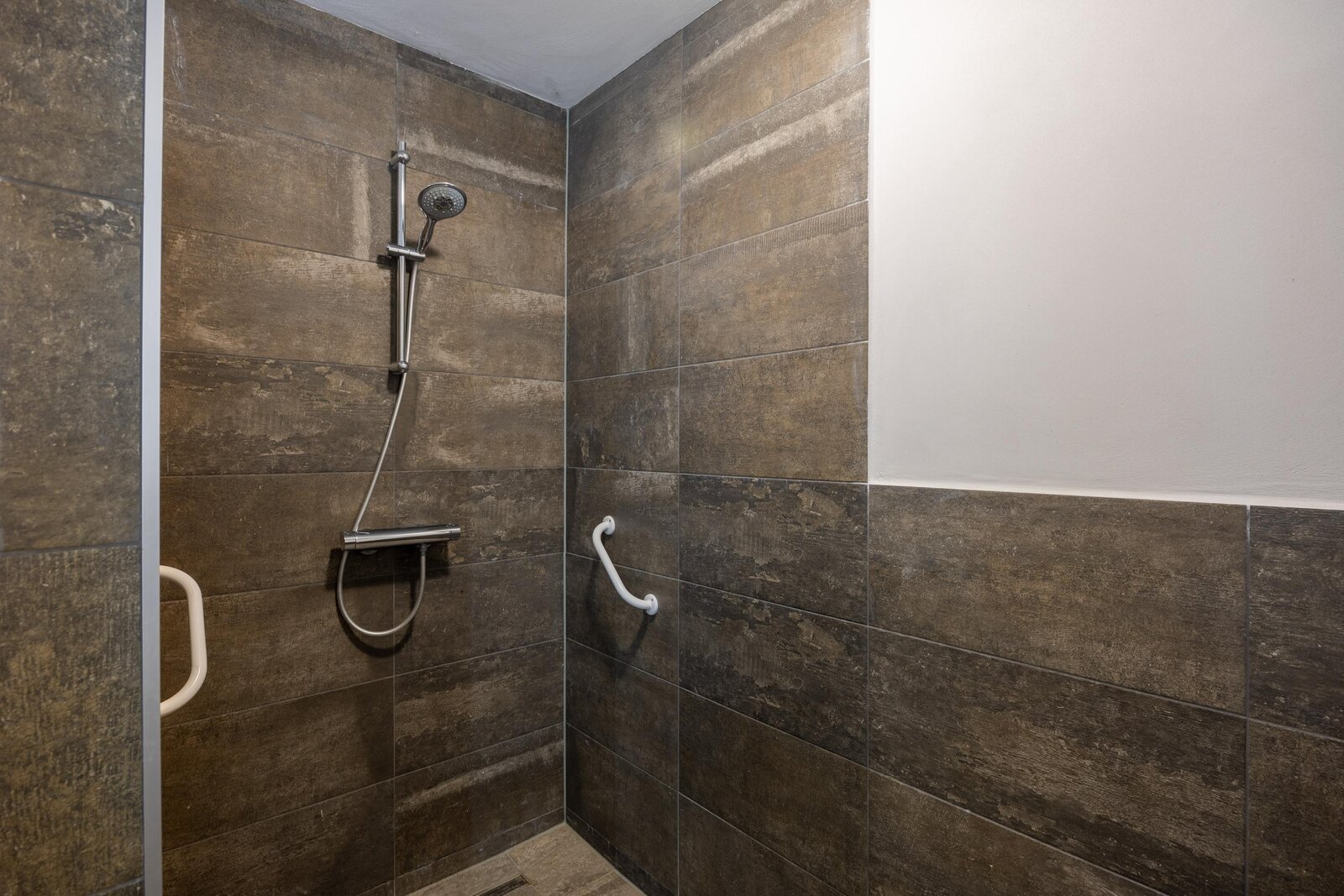 De bijkeuken is praktisch ingericht en voorzien van een inductiekookplaat met vier kookzones, een afzuigkap en een spoelbak. Vanuit hier is er toegang tot een handige opbergruimte met de aansluitingen voor het witgoed, evenals tot de ruime badkamer. De badkamer is uitgerust met een inloopdouche, een ligbad, een toilet, een bidet, dubbele wastafel en een handdoek radiator.