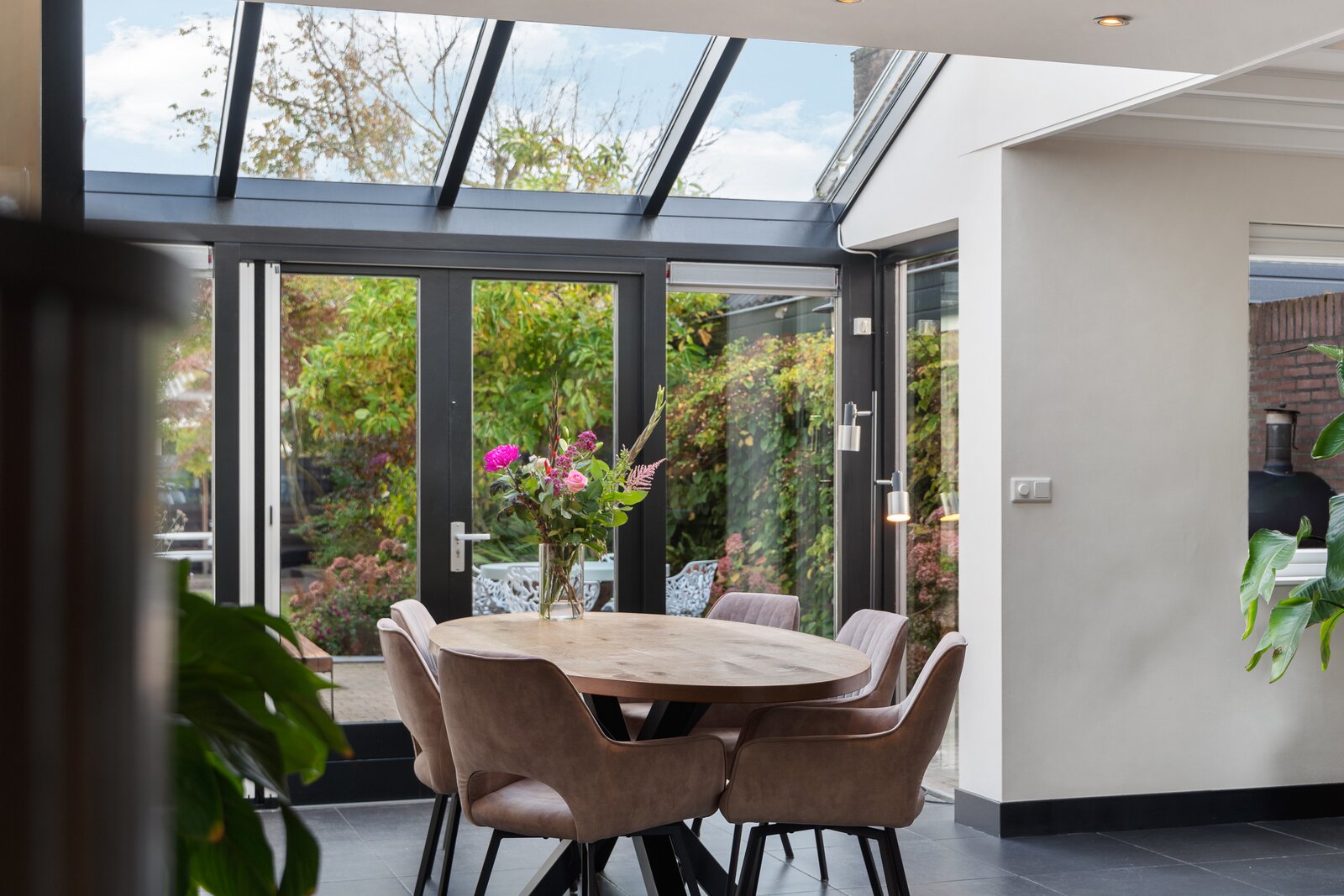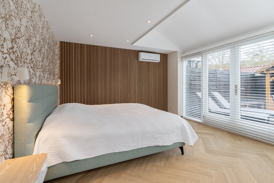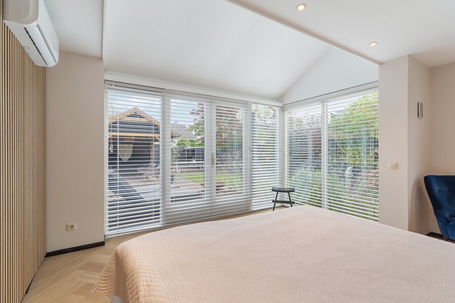 Het achterhuis is van een veel recenter bouwjaar. Omstreeks 1999 is de hoofdwoning uitgebreid met een zij-uitbouw voor het vergroten van de woonkamer, en een achter uit- en opbouw waardoor het tweede "huis" is ontstaan. Op de begane grond bevindt zich hier een luxueuze master-bedroom met royale inloopkast en een splinternieuwe badkamer (2025), ontworpen voor een ware hotelbeleving aan huis. Onder de nieuw geplaatste lichtkoepel vindt u een ruime regendouche, dubbele wastafel, vrijstaand bad en de elektrische sauna. De master bedroom heeft middels een tweede serre via openslaande deuren tevens toegang tot de diepe achtertuin. Een verdieping hoger bevindt zich de vierde slaapkamer van het huis die dankzij de hoge nok profiteert van een mooie lichtinval en tevens een eigen badkamer tot zijn beschikking heeft.