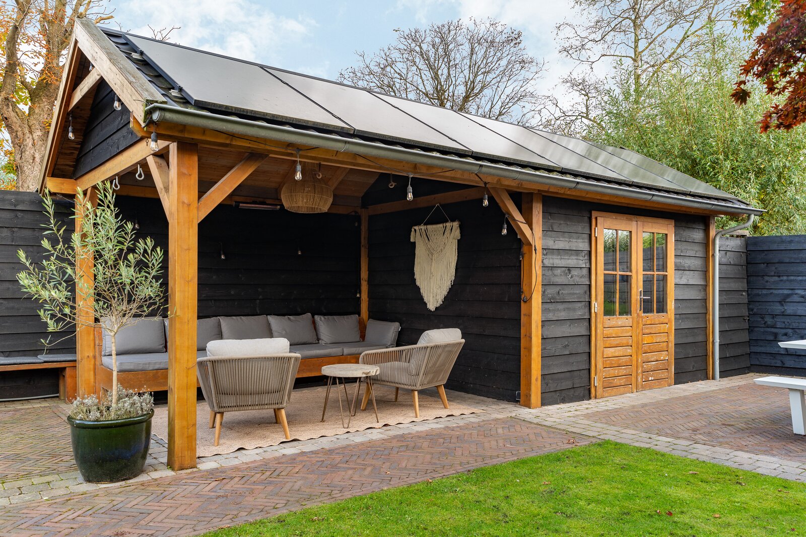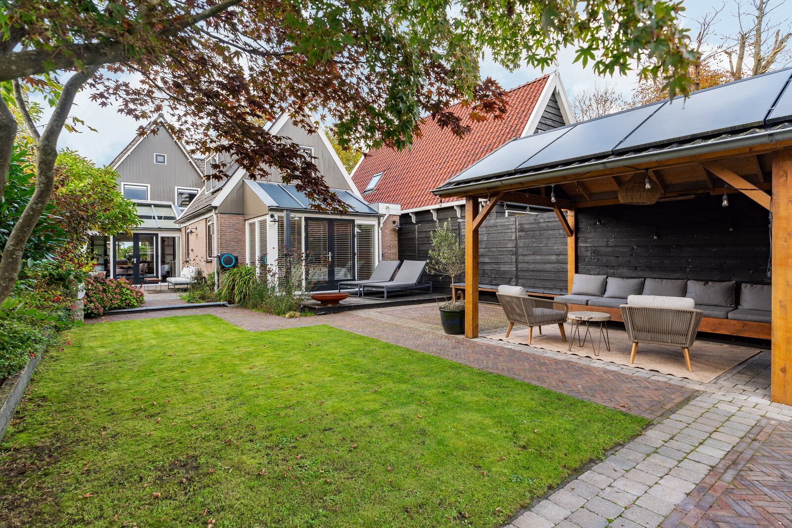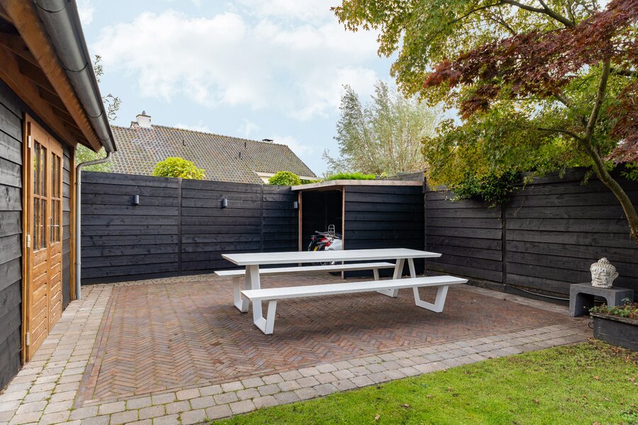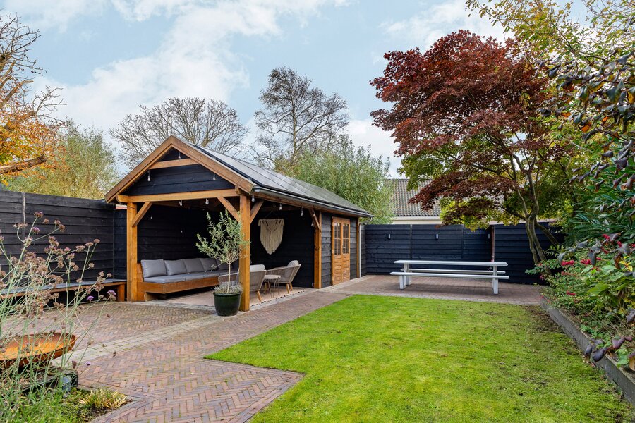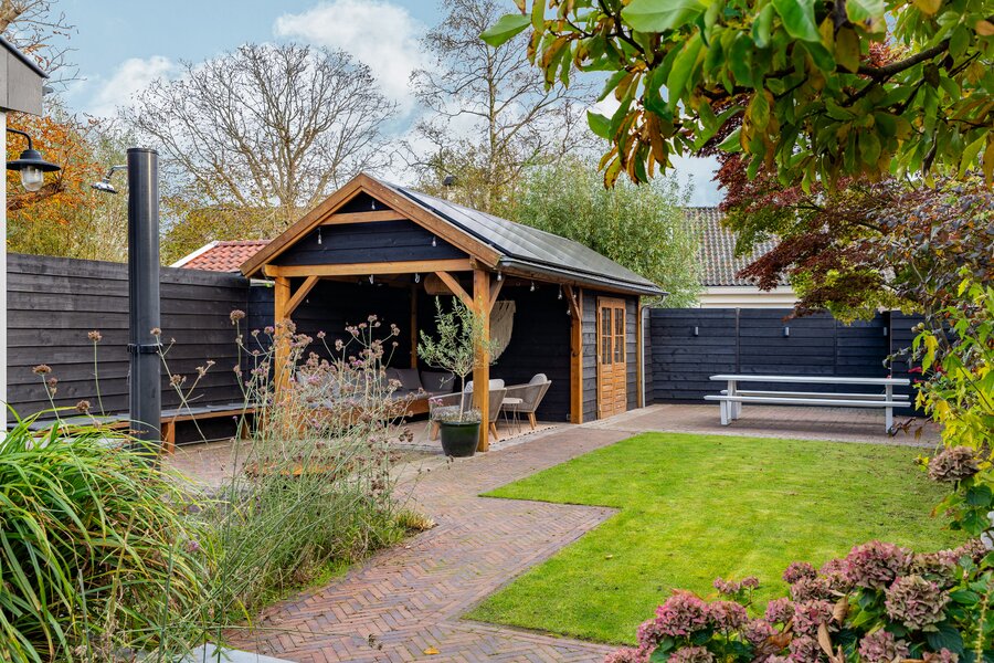 De fraai aangelegde tuin (ZO) biedt veel privacy en ligt uitstekend op de zon waarvan u tot in de kleine uurtjes kan genieten. Met diverse zithoeken - van het terras direct aan het huis tot de moderne overkapping achterin - is dit de ideale plek om te genieten van lange zomeravonden in de buitenlucht of een knusse winterse BBQ. De tuin is van alle gemakken voorzien, sfeervolle tuinverlichting, een buitendouche, een overdekte plek om de fiets- of scooter te stallen, en een achterom.