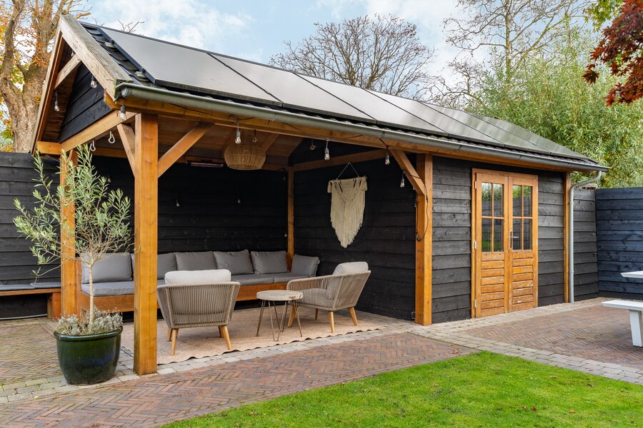 • Een diepe en verzorgde tuin met goede zonligging (ZO), buitendouche en overkapping;