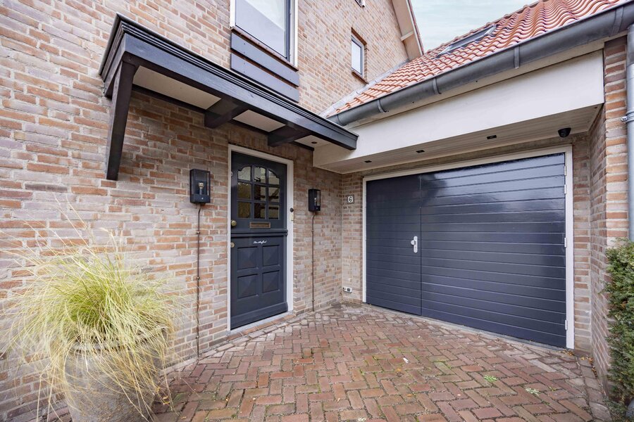 De voortuin is verzorgd aangelegd met volwassen groen en biedt twee opritten. Een oprit geeft toegang tot de werkplaats, de andere leidt naar de woning en biedt ruimte aan meerdere voertuigen.