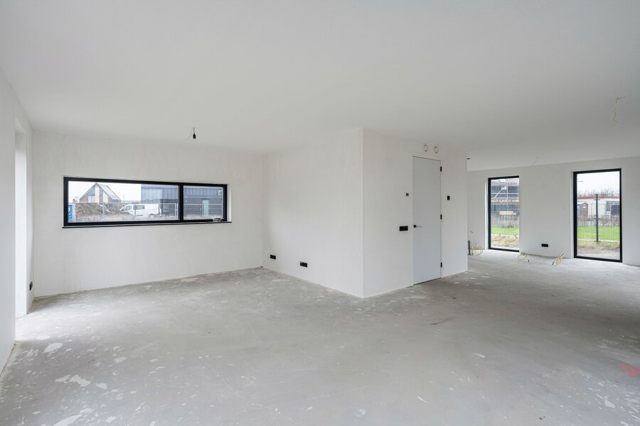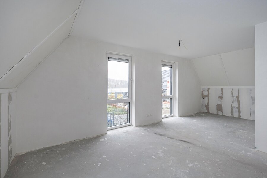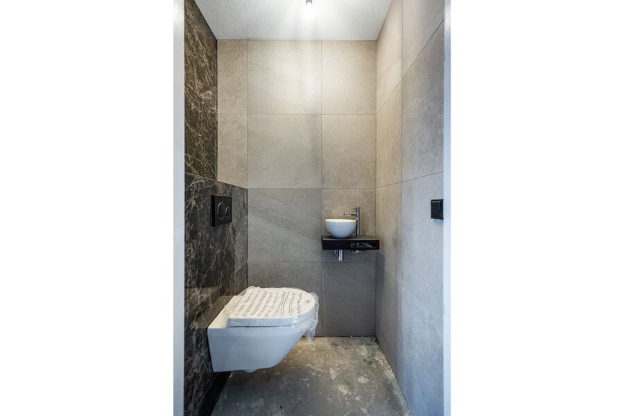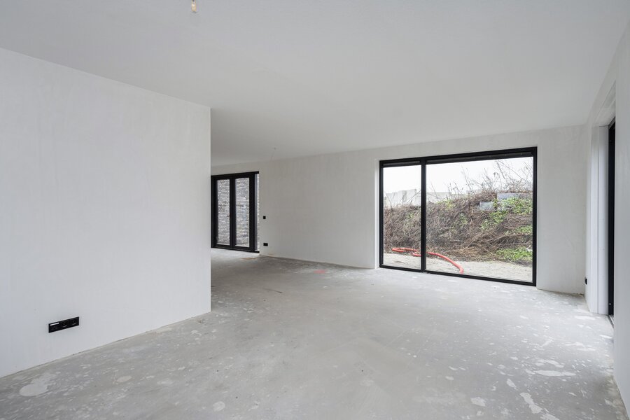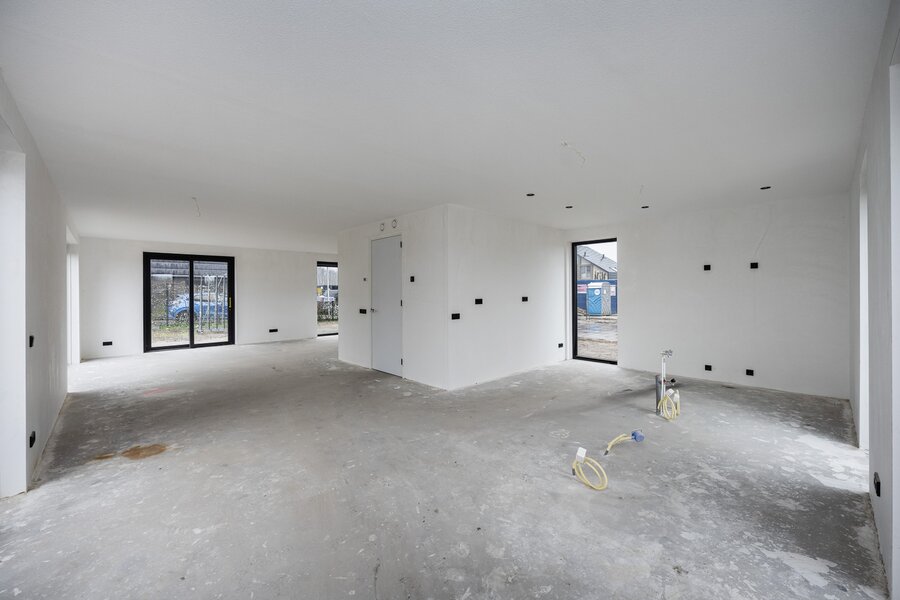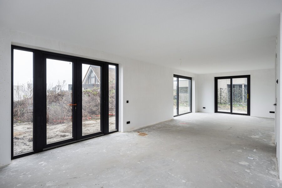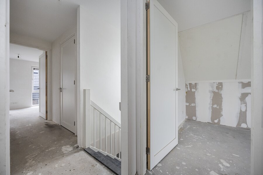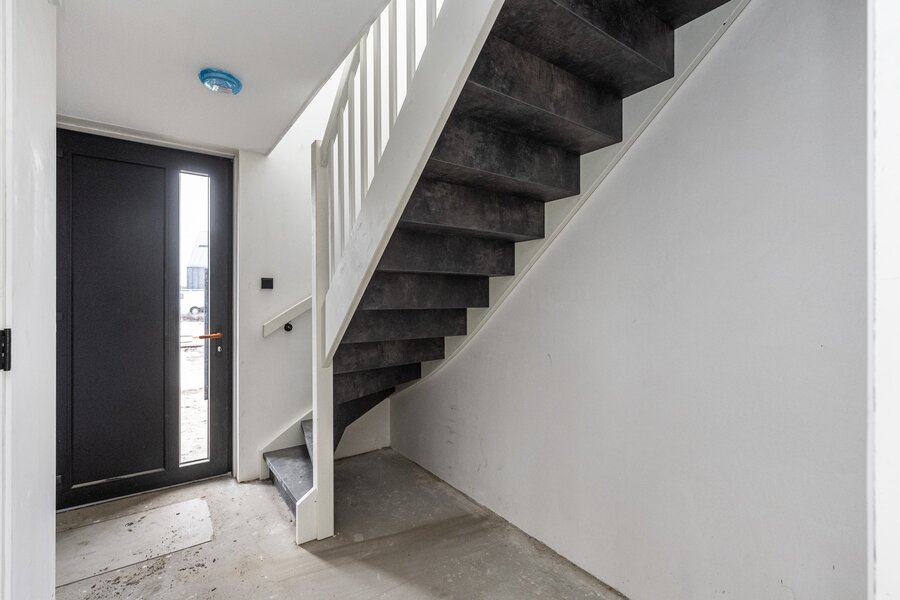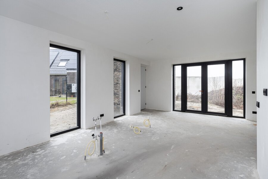 Entree met meterkast, mooie hal met trapopgang en een modern toilet met fonteintje. Je komt binnen in de heerlijk ruime leefruimte, een grote lichte doorzonkamer met veel ramen en een royale open keuken. Keuzes voor wat betreft de keuken kunnen nog (deels) gemaakt worden. Het installatiewerk is gedaan, waardoor er nu ruimte is voor een kook- en spoeleiland en hoge kasten met apparatuur (overleg met keukenleverancier mogelijk). Er zijn vanuit de keuken openslaande deuren naar de tuin en aan de zijkant vanuit de woonkamer een schuifpui naar buiten. Vanuit de keuken loop je zo door naar de praktische technische ruimte met o.a. de aansluitingen voor de wasapparatuur ofwel bijkeuken en daarachter een berging. Begin januari worden er op de begane grond prachtige zwarte binnendeuren geplaatst.