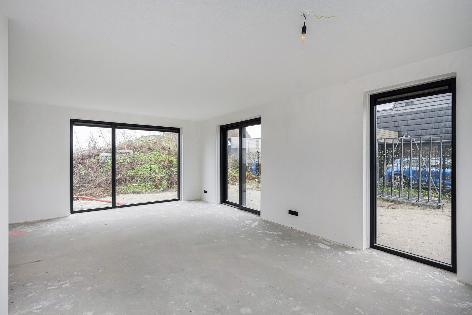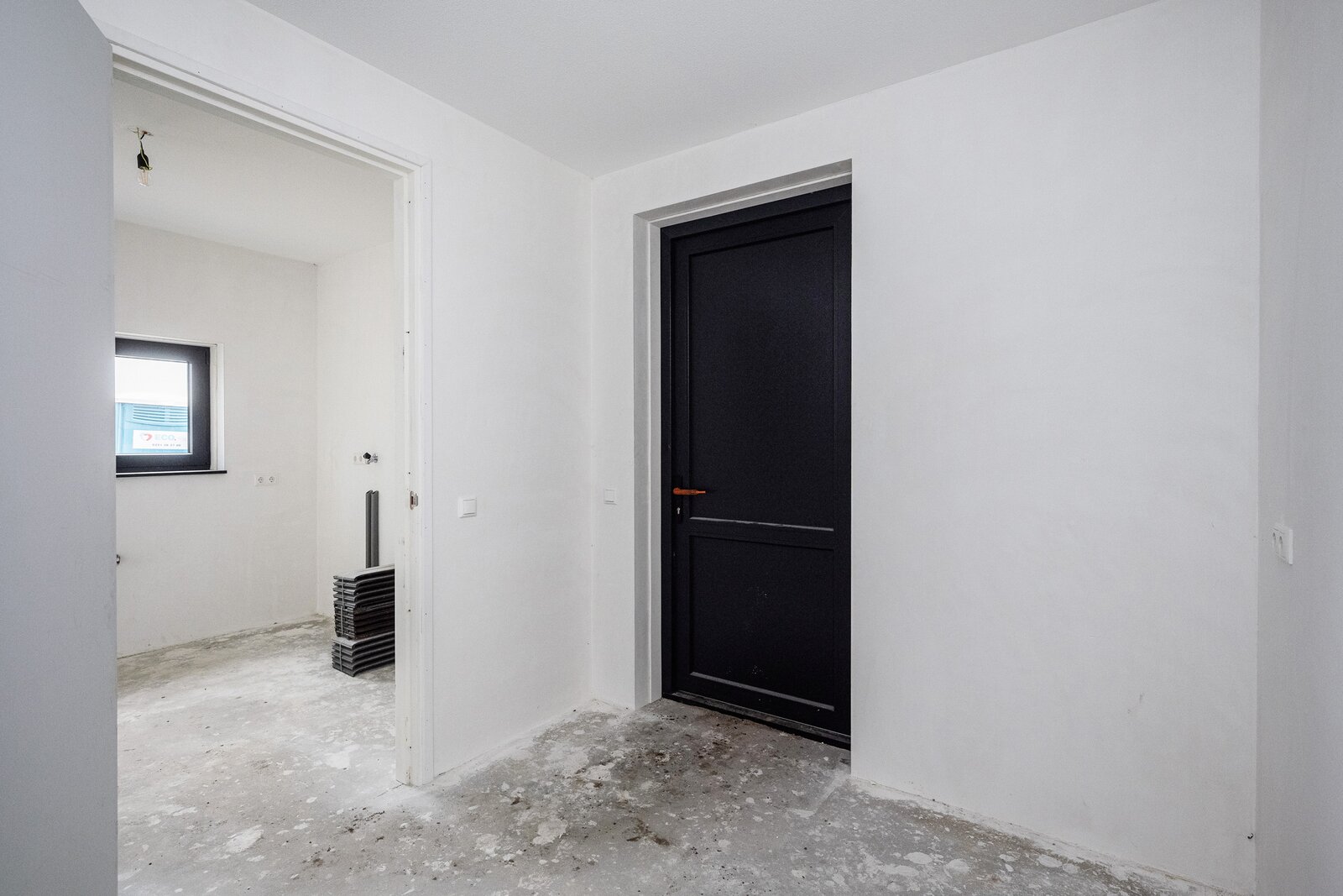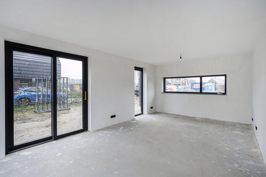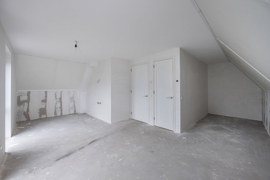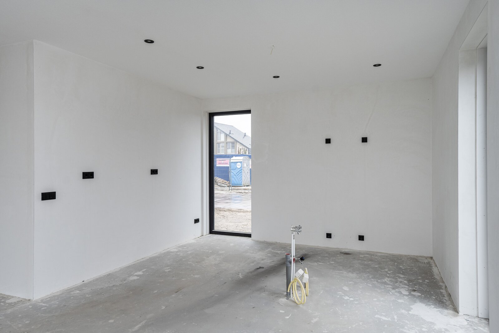 Entree met meterkast, mooie hal met trapopgang en een modern toilet met fonteintje. Je komt binnen in de heerlijk ruime leefruimte, een grote lichte doorzonkamer met veel ramen en een royale open keuken. Keuzes voor wat betreft de keuken kunnen nog (deels) gemaakt worden. Het installatiewerk is gedaan, waardoor er nu ruimte is voor een kook- en spoeleiland en hoge kasten met apparatuur (overleg met keukenleverancier mogelijk). Er zijn vanuit de keuken openslaande deuren naar de tuin en aan de zijkant vanuit de woonkamer een schuifpui naar buiten. Vanuit de keuken loop je zo door naar de praktische technische ruimte met o.a. de aansluitingen voor de wasapparatuur ofwel bijkeuken en daarachter een berging. Begin januari worden er op de begane grond prachtige zwarte binnendeuren geplaatst.