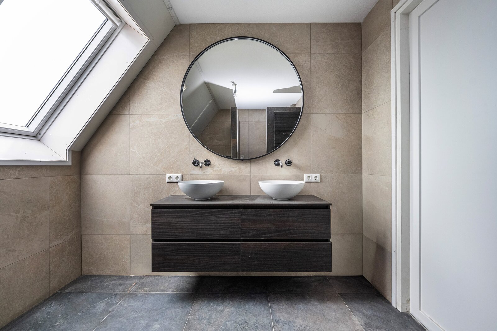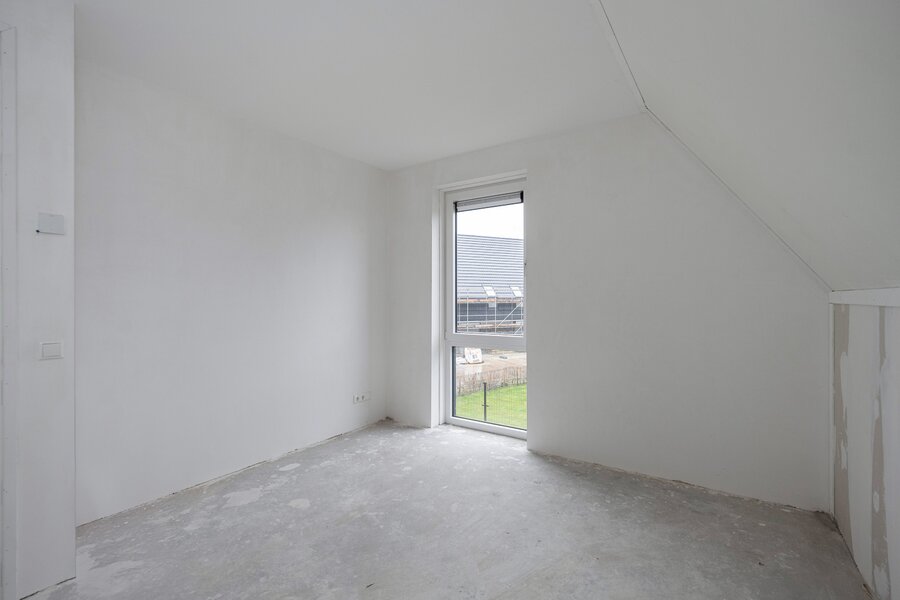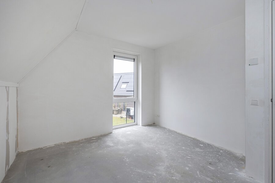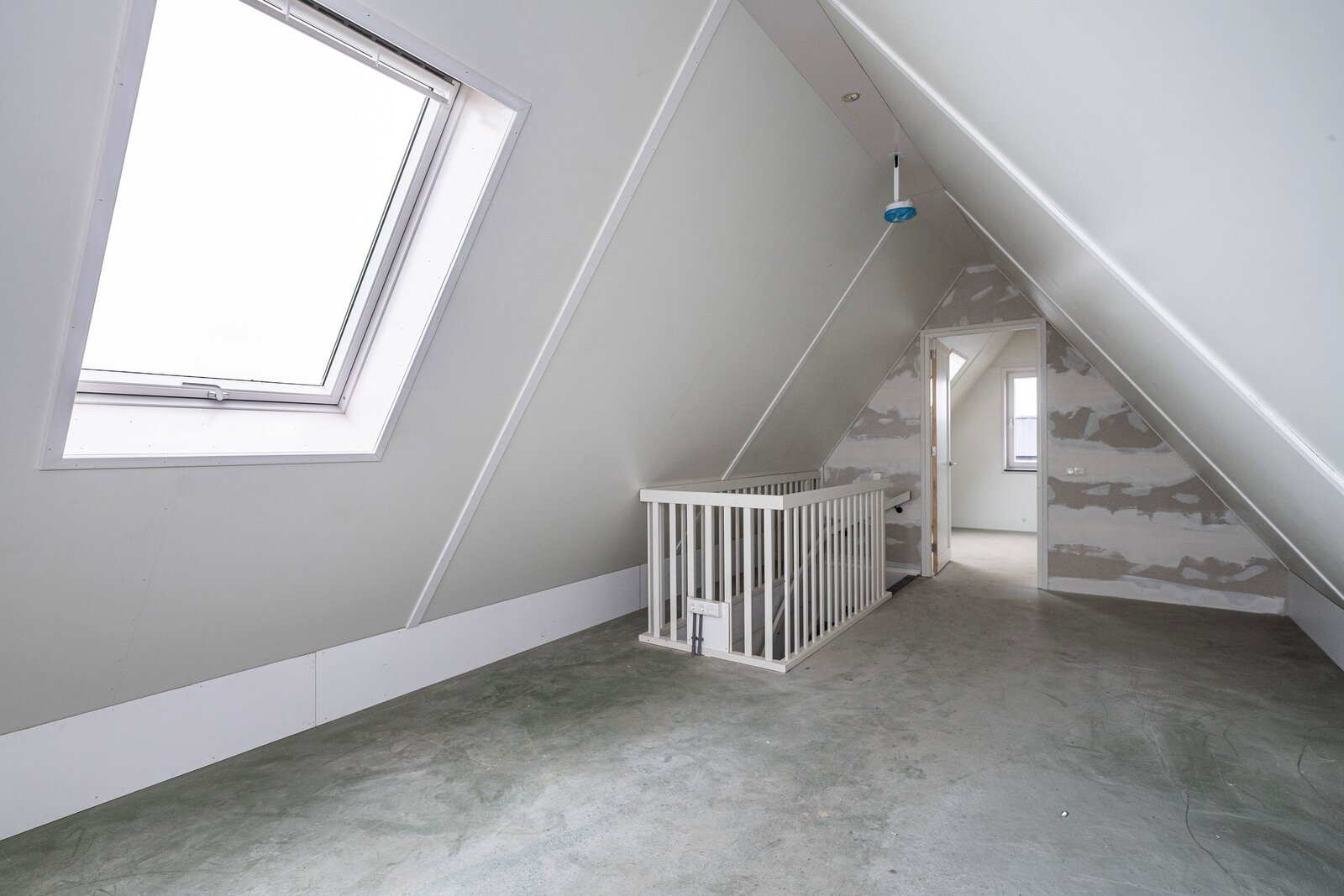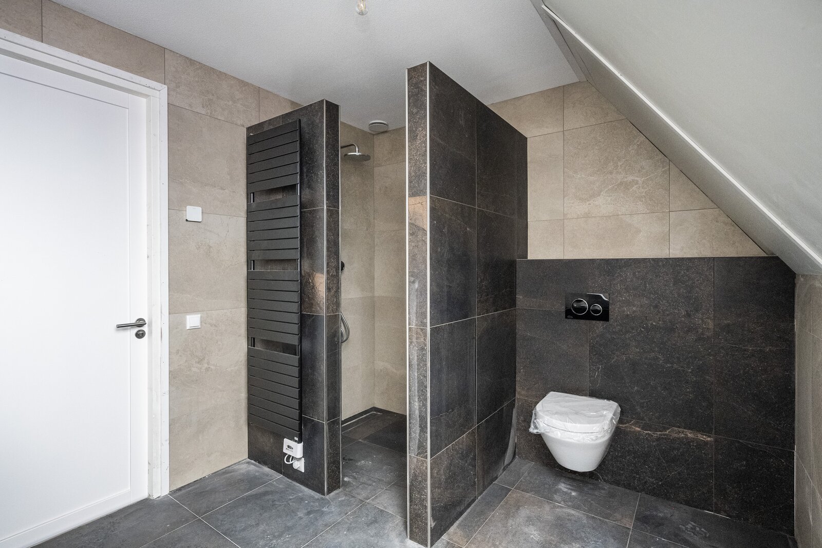Via een vaste trap kom je op de overloop op de verdieping. Hier vind je toegang tot de drie mooie grote slaapkamers. De grootste slaapkamer vind je over de volle breedte van de woning en is voorzien van een ruime inloopkast en een extra bergruimte onder de trap naar de tweede verdieping. De badkamer is luxe uitgevoerd en reeds geïnstalleerd. Voorzien van een inloopdouche, een tweede toilet, een dubbel wastafelmeubel met waskommen en een bijpassende spiegel. Een raam zorgt voor frisse lucht en daglicht.